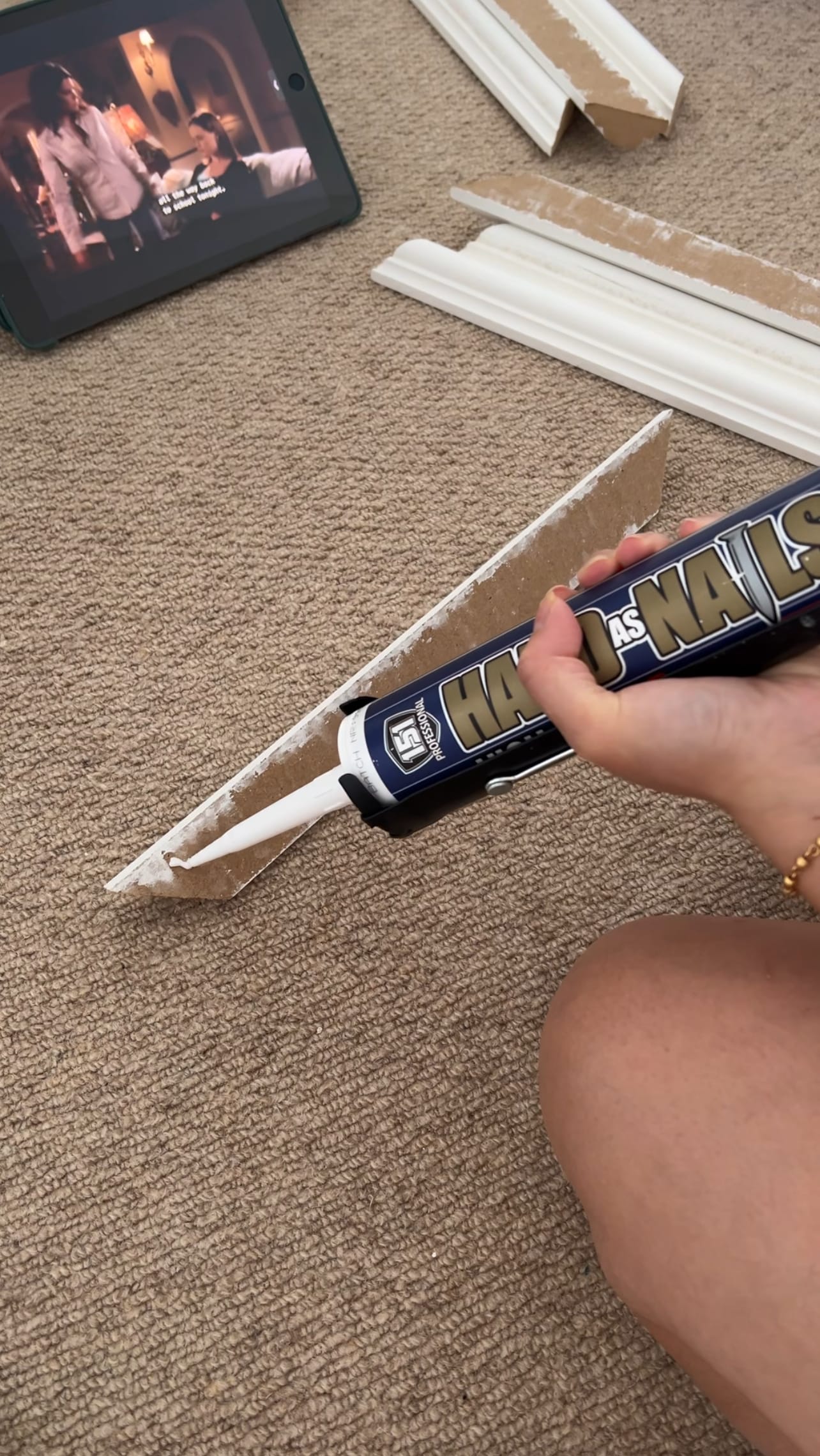 The MDF mouldings were pre-primed, so I used Hard as Nails adhesive to attach them to the wardrobes. Since they’re a bit heavy, there was some slipping, so I used Frog Tape to hold them in place while they dried - this won't peel off any primer when removed. Once they were secure and dry, I caulked around the moulding edges for a smooth, seamless finish, and to fill any gaps in my cuts.