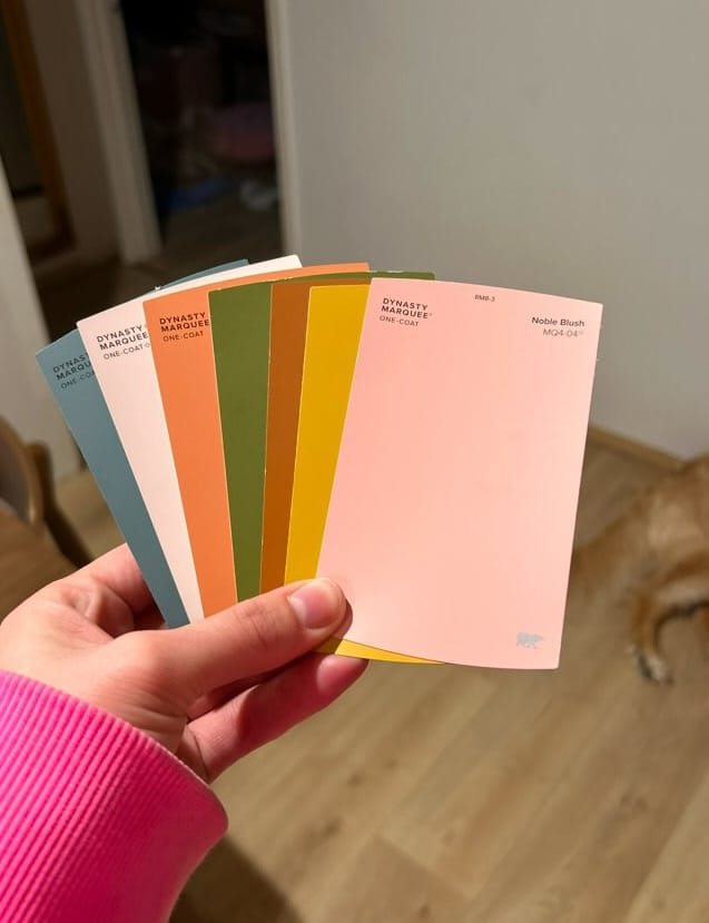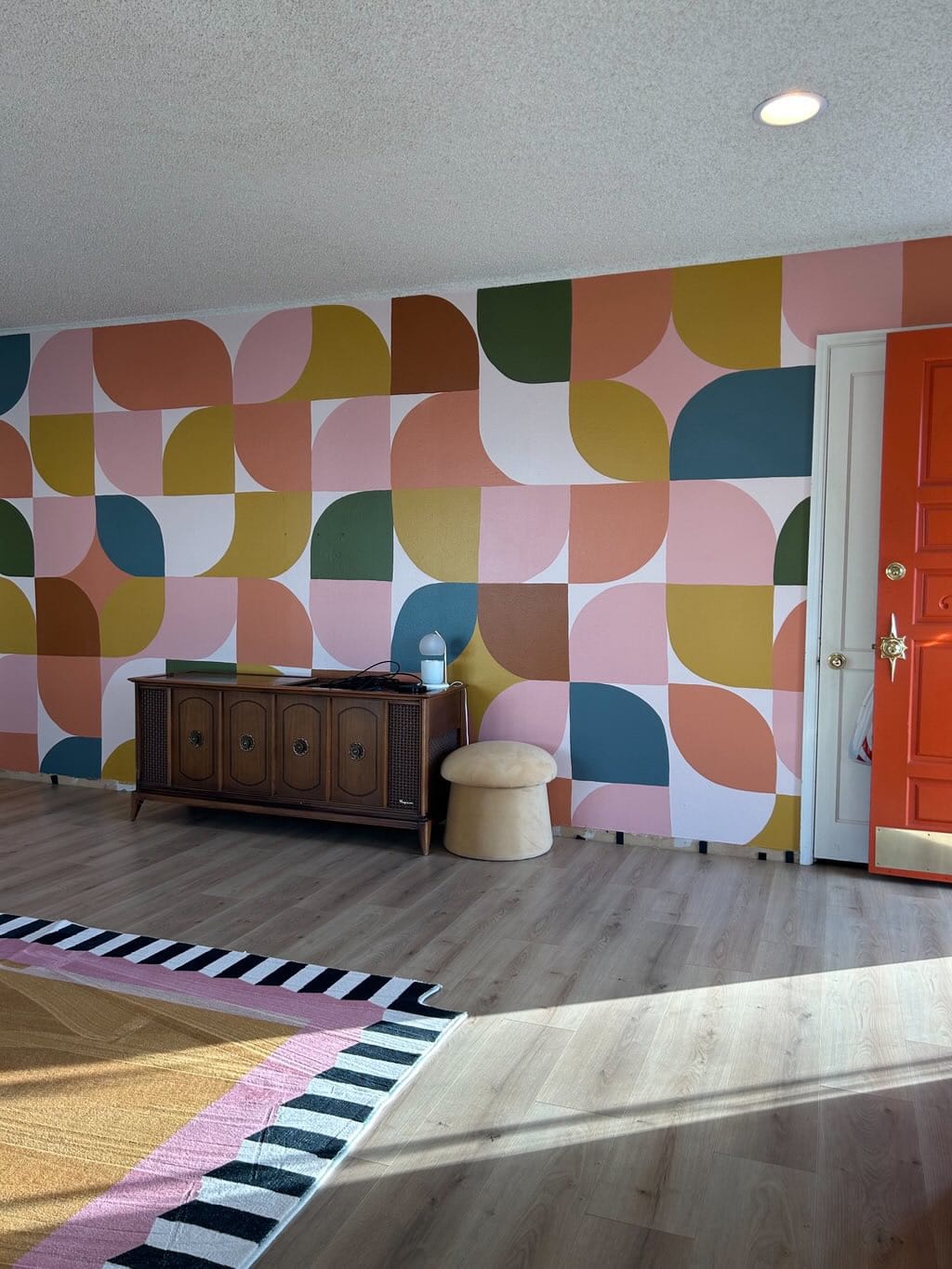 With my shapes traced out, I carefully planned where each color would go. I wanted a balanced mix without any two identical colors next to each other. I also decided to use fewer blue and green shapes—just 2-3 of each—while the other colors would dominate the wall.