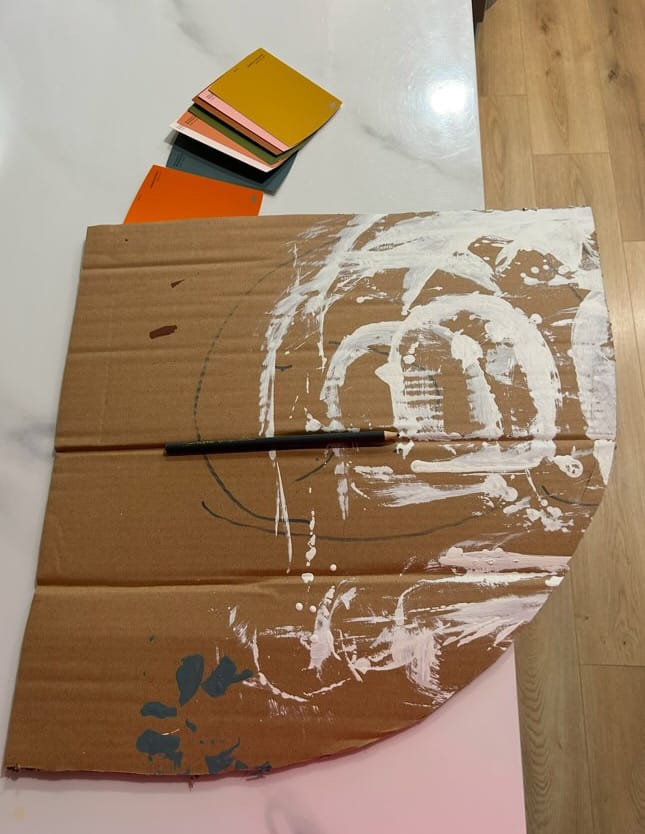 I started by browsing different wallpaper designs on Pinterest for inspiration. Once I found a shape I loved, I traced it onto a cardboard box and cut it out to create my stencil. This cardboard stencil was the key to achieving uniform shapes across the wall.
