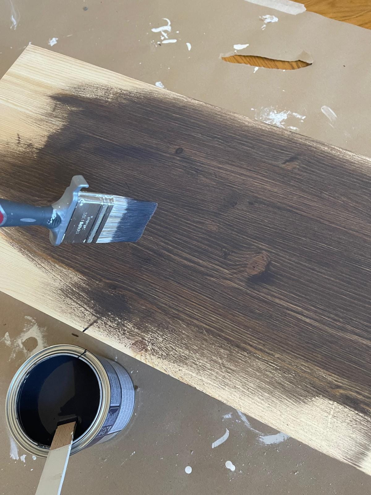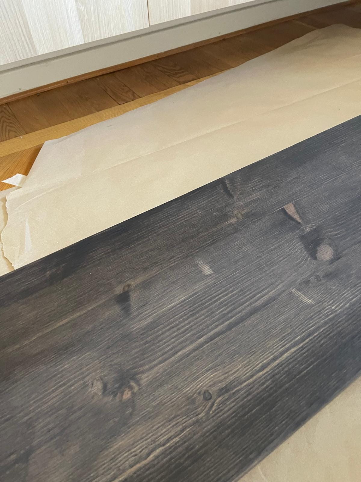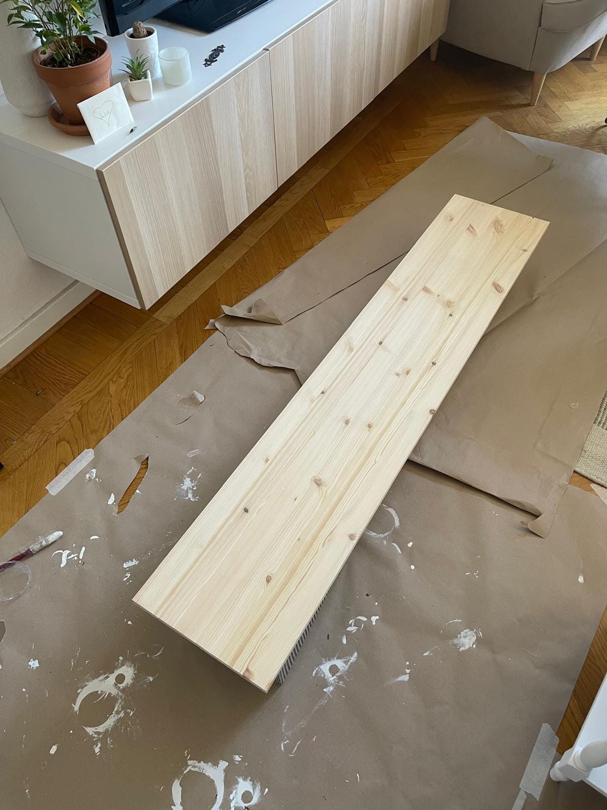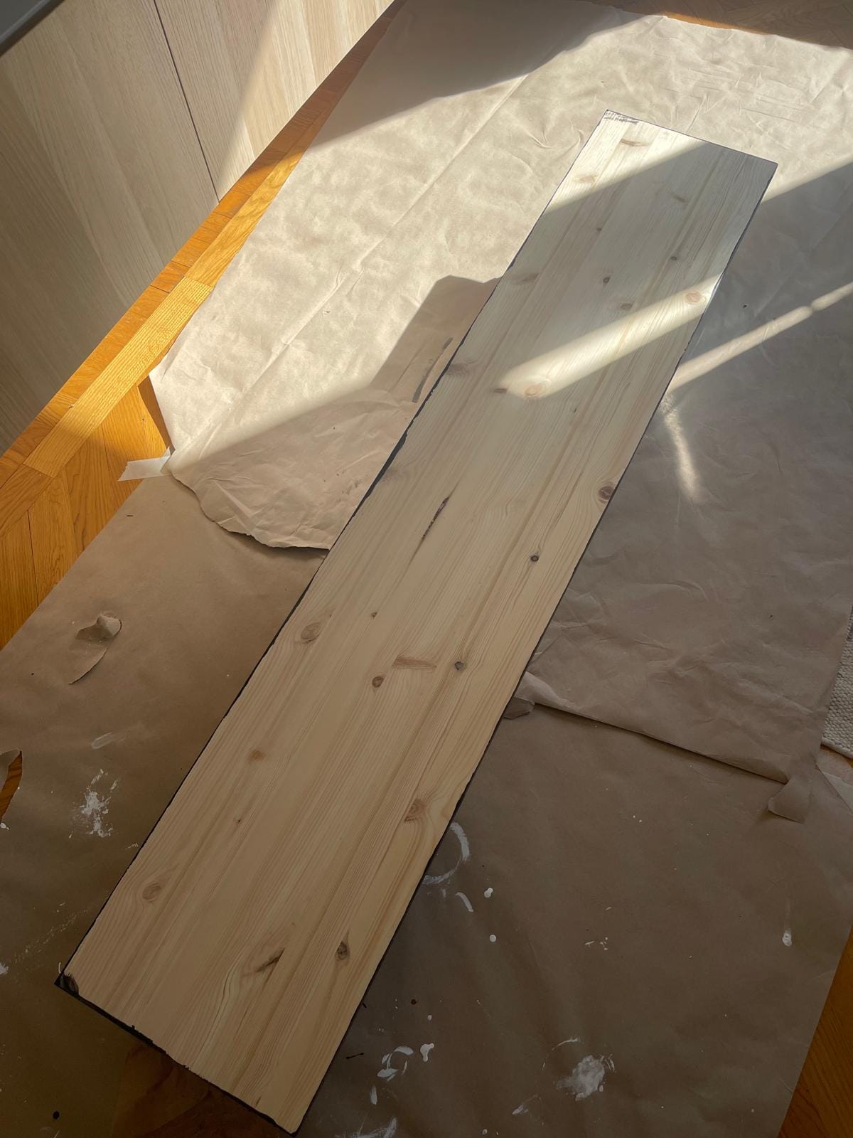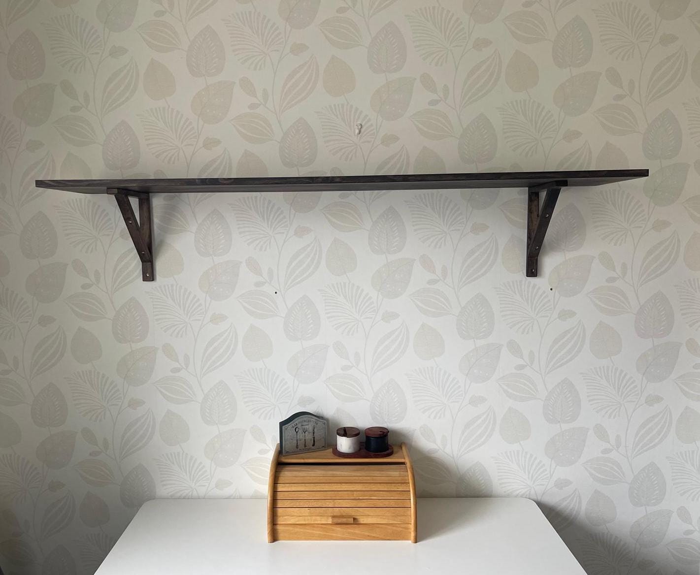 Before we mounted anything, we gave our shelves a coat of dark wood oil paint. It added this gorgeous, moody warmth that really made the grain pop. But here’s the thing—we said we were beginners, and we weren’t lying. We had no idea how to oil shelves properly, and it showed. The edges looked super wonky, uneven, and streaky.