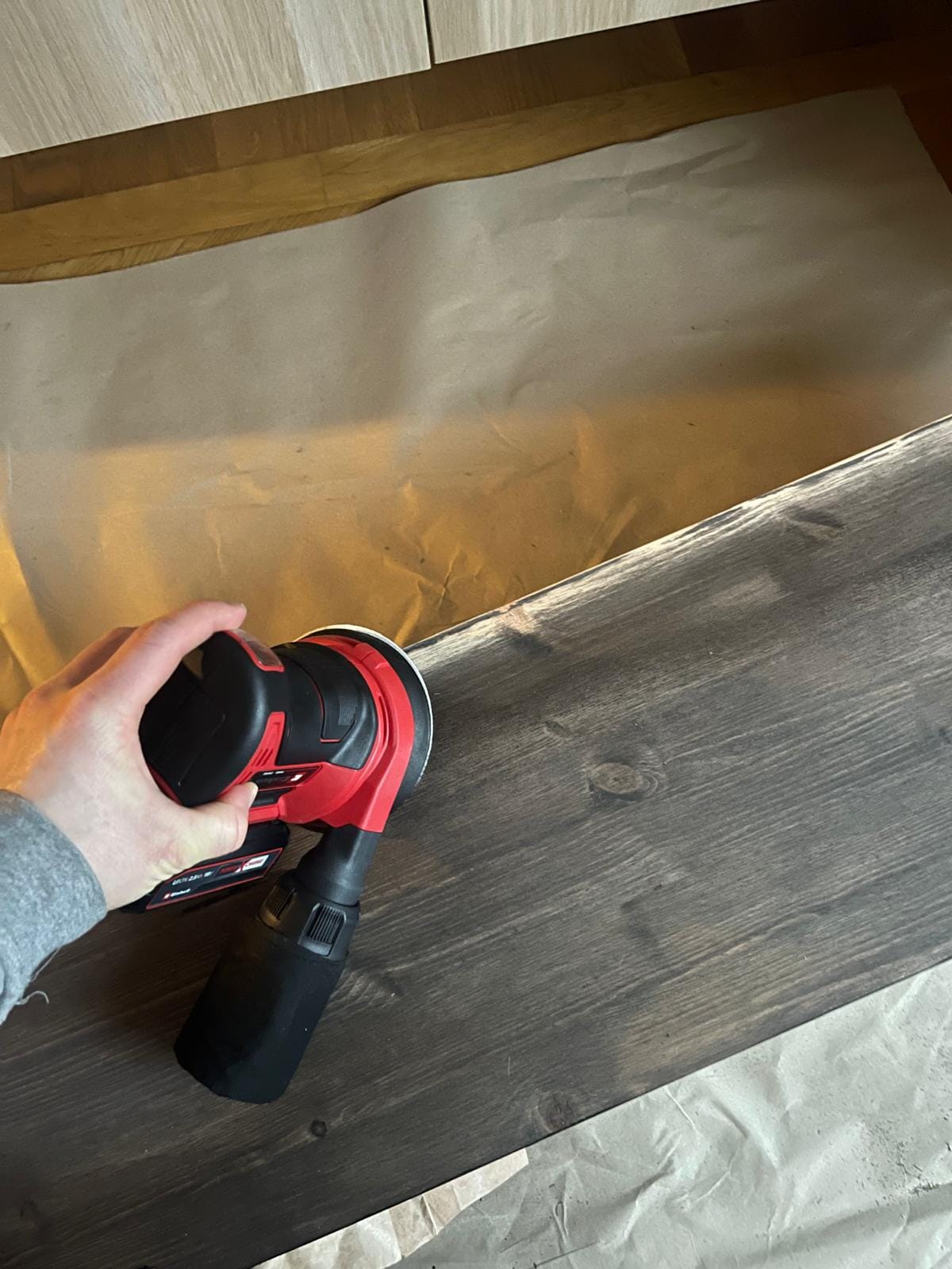 Cue the Einhell TE-RS 18 Li orbital sander—this tool seriously saved this project. We sanded everything down and started again, but this time, we came prepared (AKA watched three YouTube tutorials). And guess what? Thanks to its built-in dust collection sock, we could redo everything indoors without turning the room into a dust storm. Lifesaver! Clean floors, clean air, clean results.