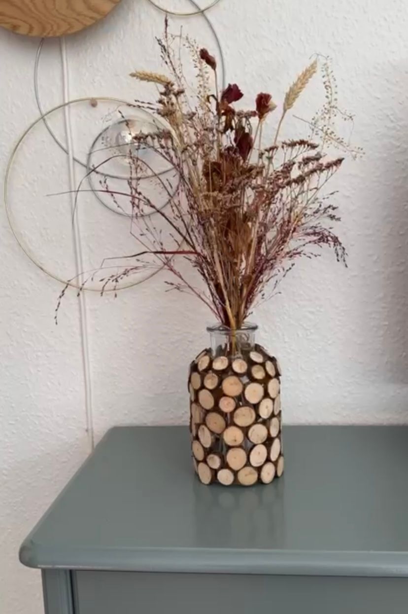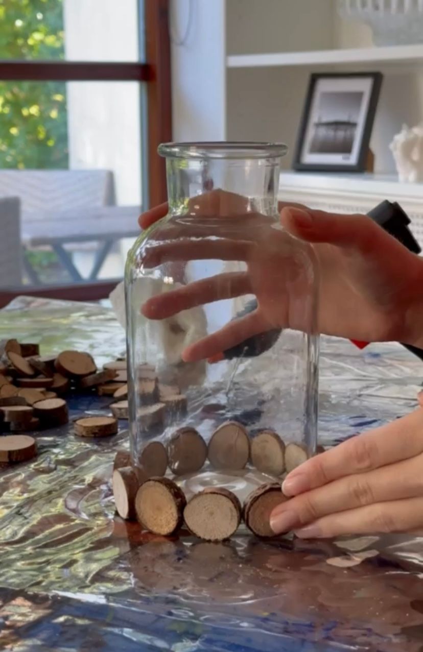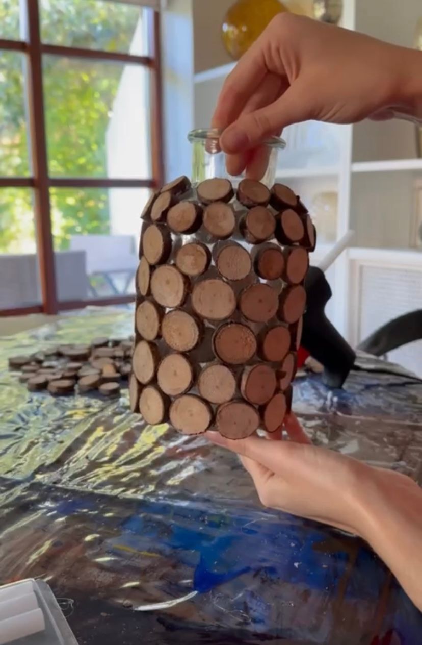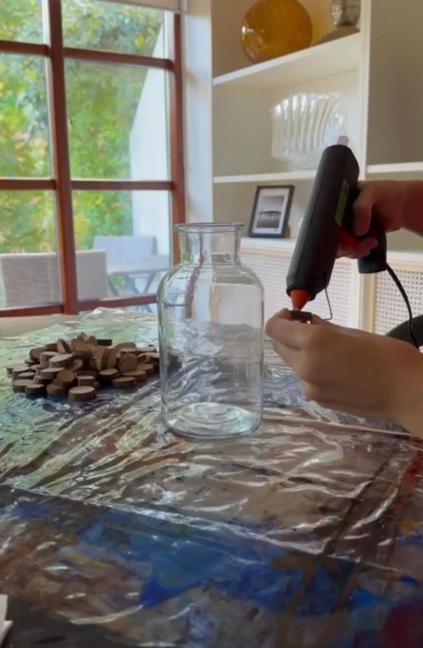 Fire up your trusty hot glue gun and start attaching the wood slices to the vase. Get creative with the arrangement and spacing.