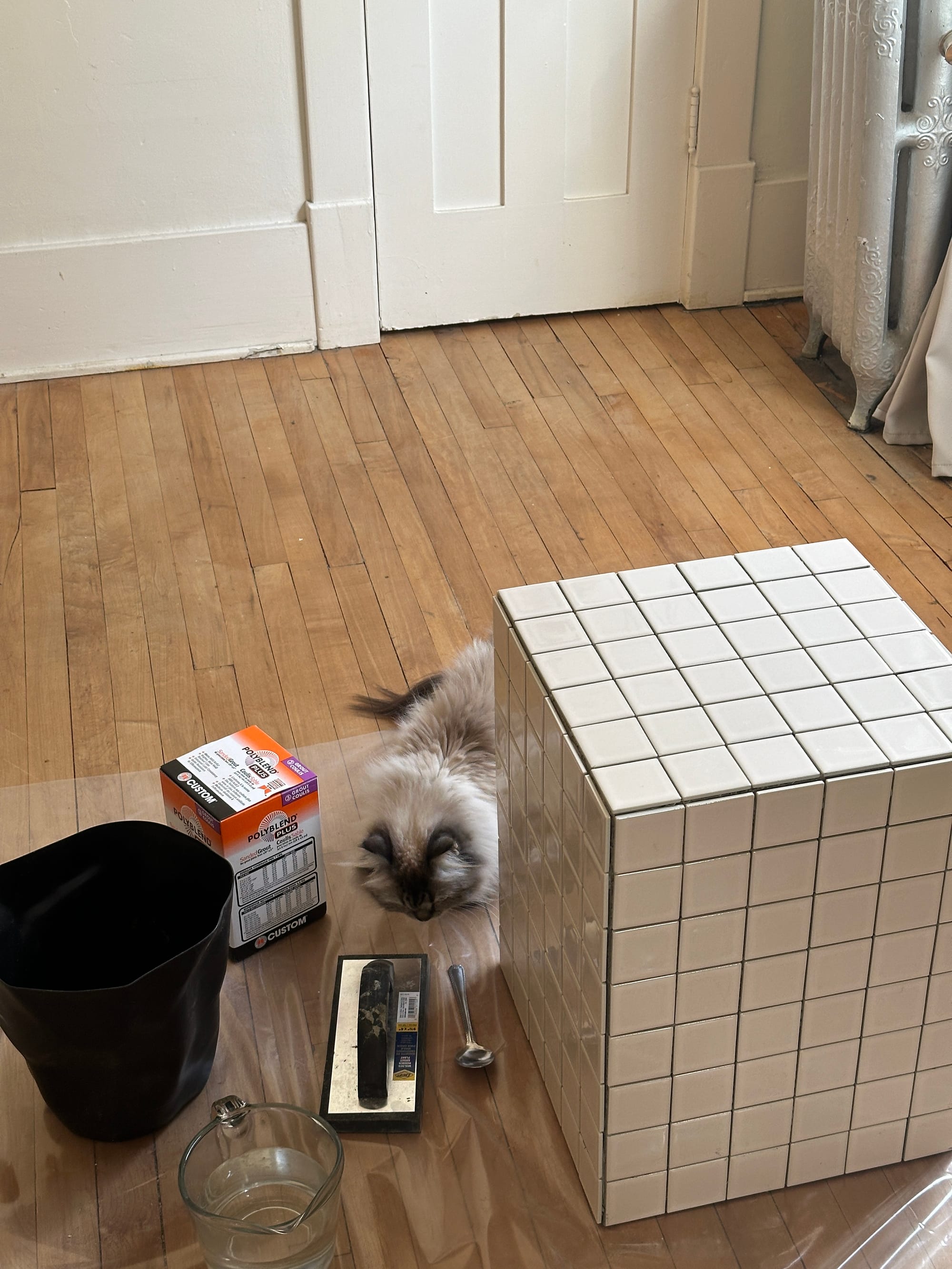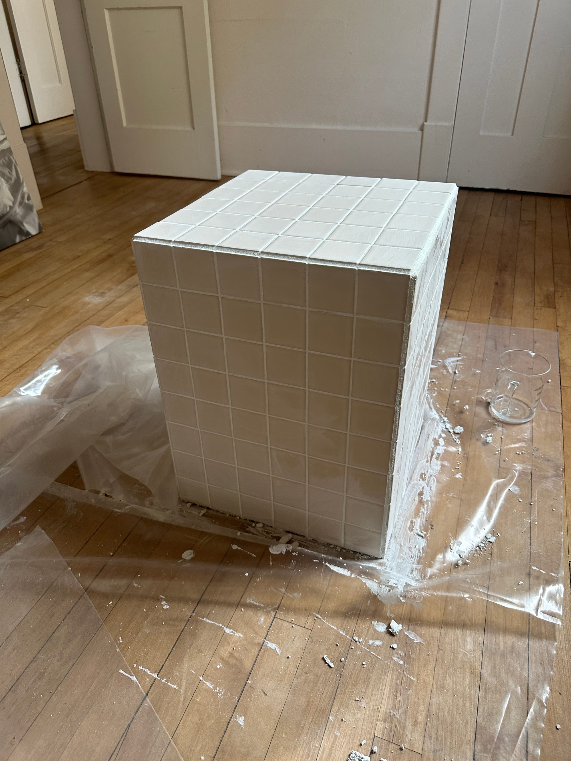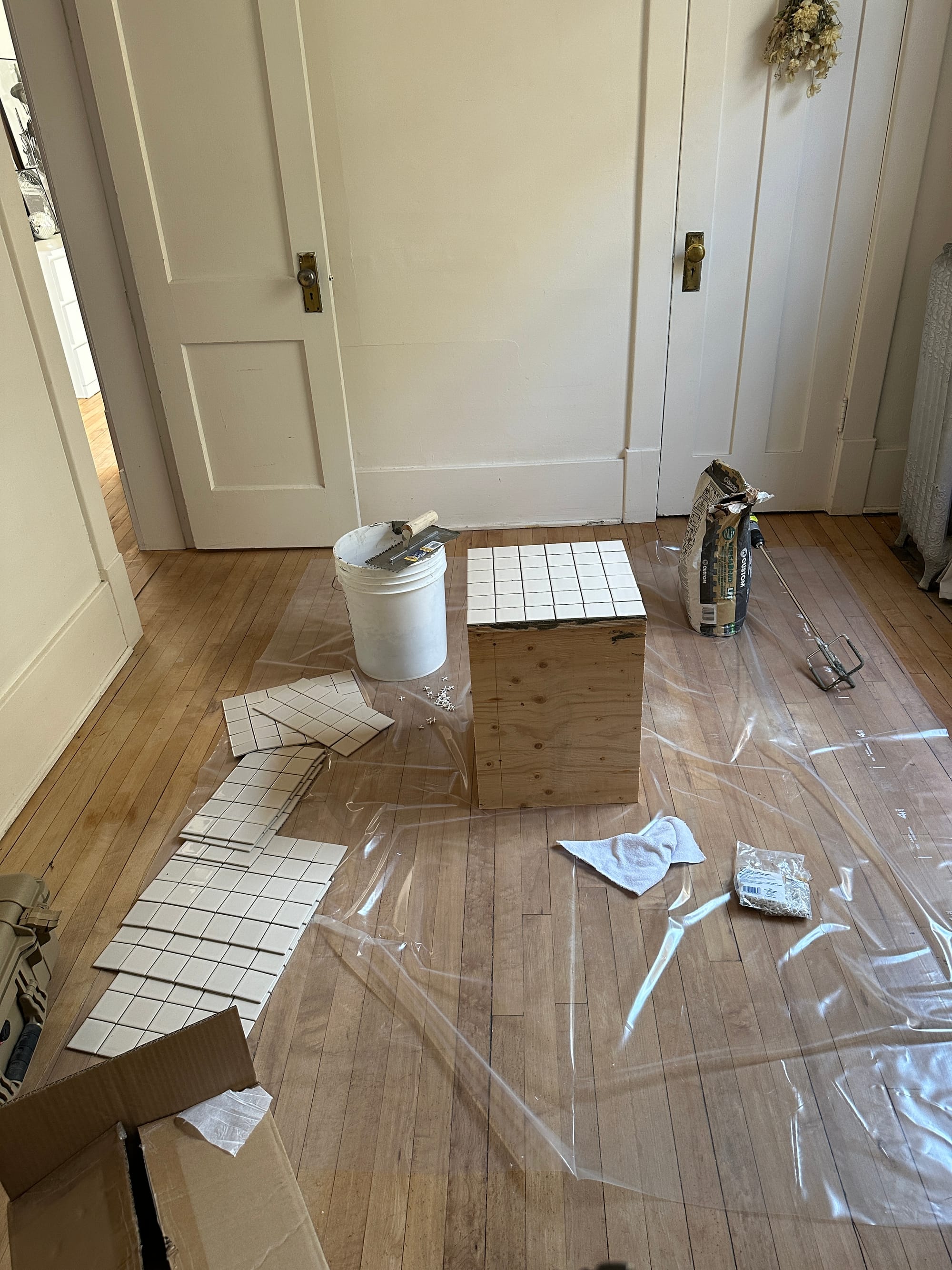 I always wanted to try tiling, and while I had watched it be done quite a few times, I had never tried it for myself. Furnishing our new apartment was just the motivation I needed to try my hand at making some tiled stools for extra seating around our large dining table, but most of the time they double as end tables. It was intimidating to get started, however I had found some square tile mosaics on Facebook marketplace for a steal of a deal so I figured there wasn’t a whole lot of risk!