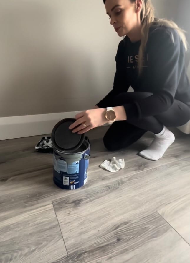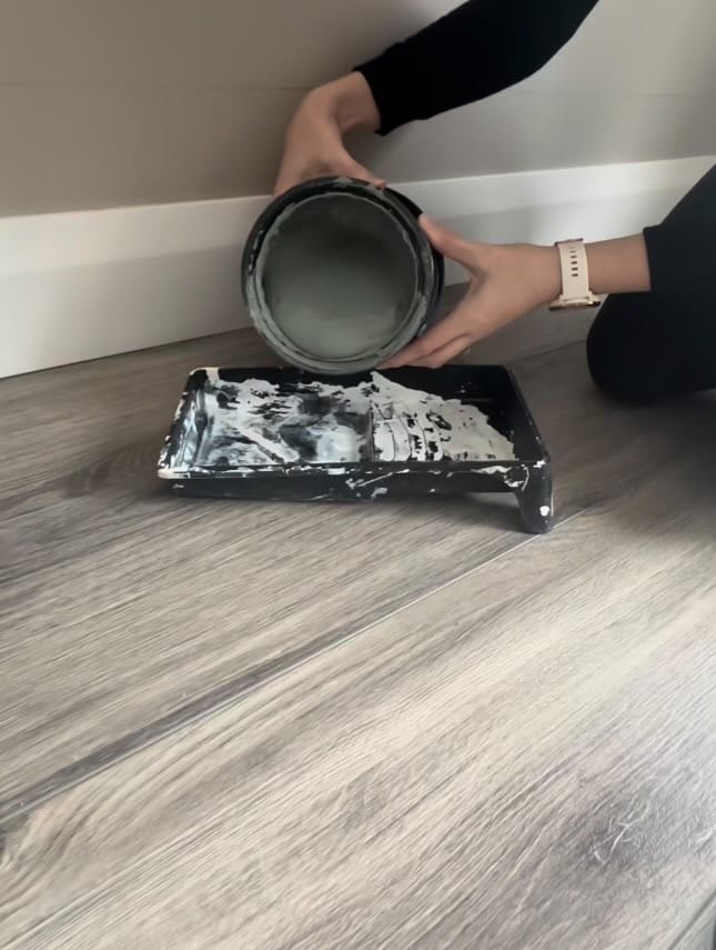 Pour your paint (Wild Eden by Dulux) into a small paint tray. This makes it easier to manage and reduces the risk of spills and drips.