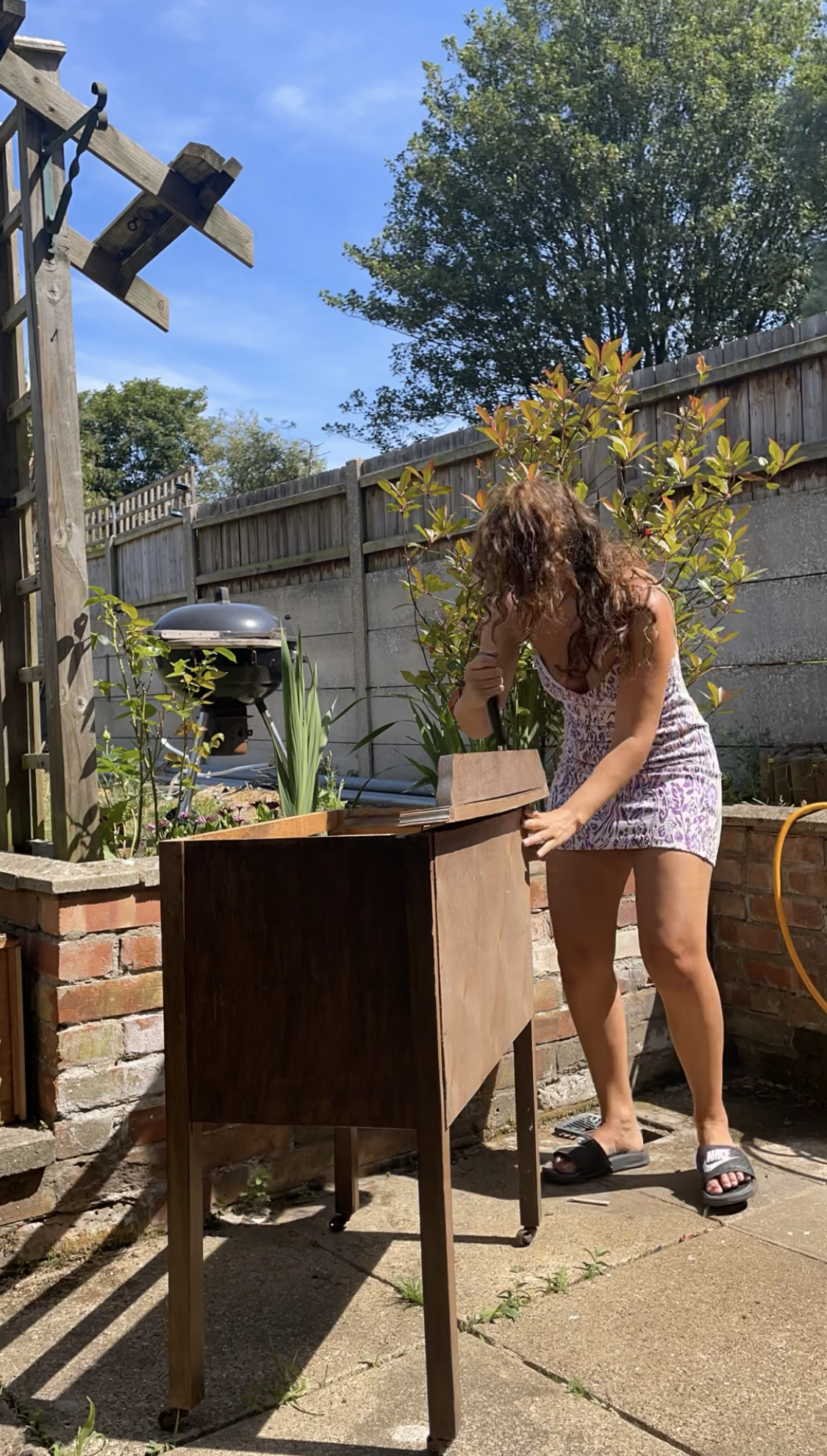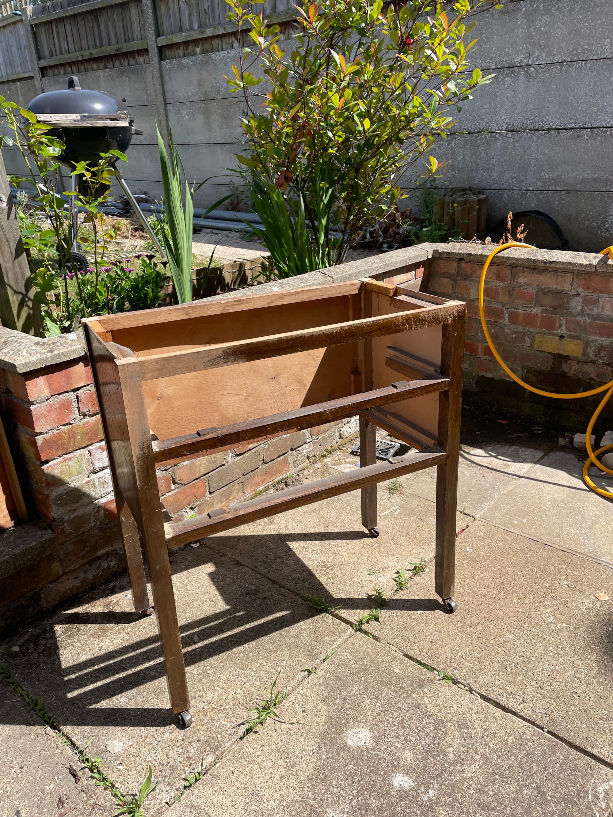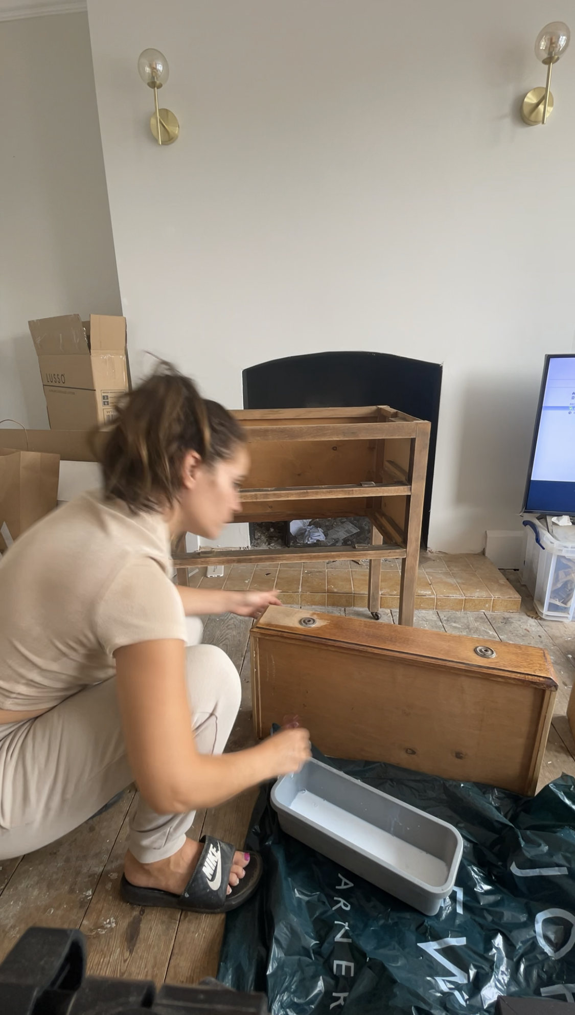 I sanded the entire sideboard to create a smooth, even surface. This step is essential to help the varnish adhere properly.