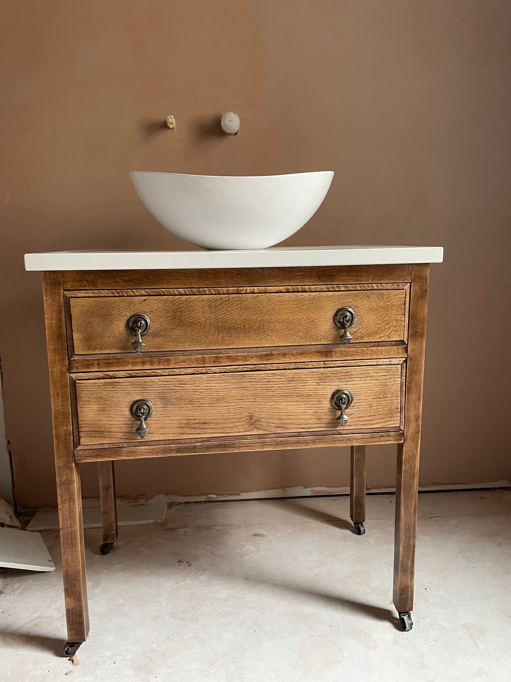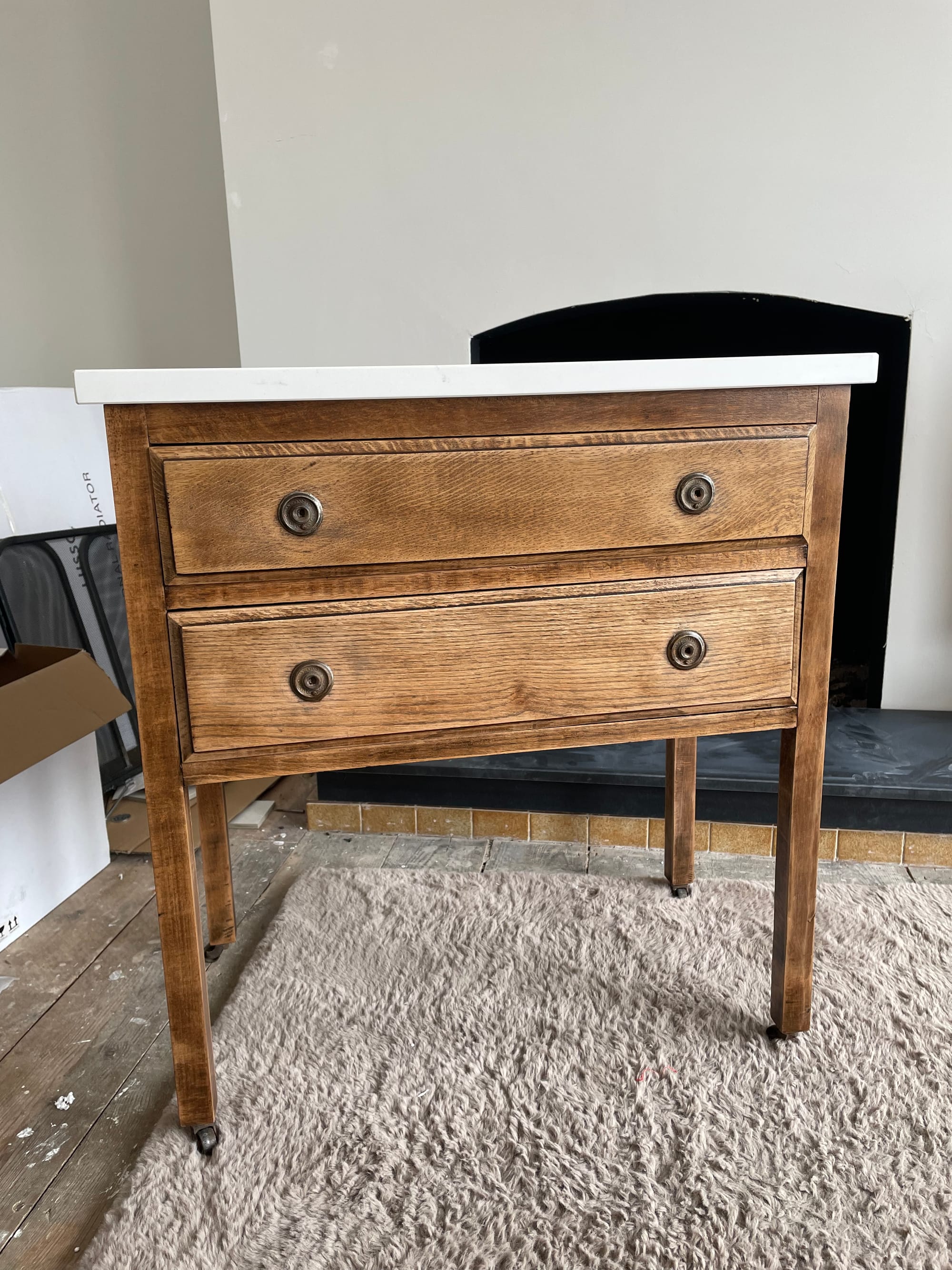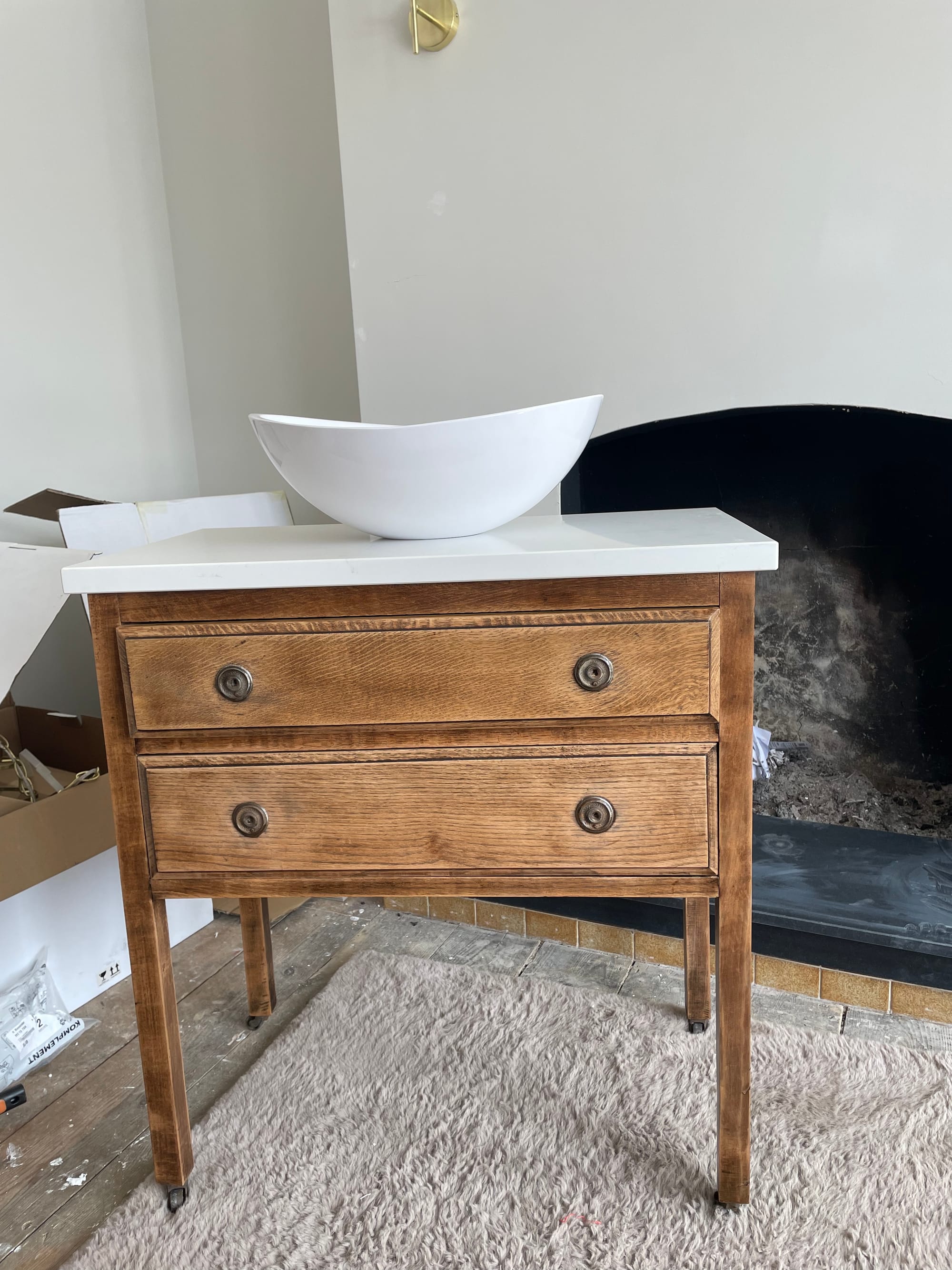 I wanted a more luxurious feel, so I decided to swap out the existing top for a quartz piece. If you prefer a more rustic look, you could keep the wooden top instead.