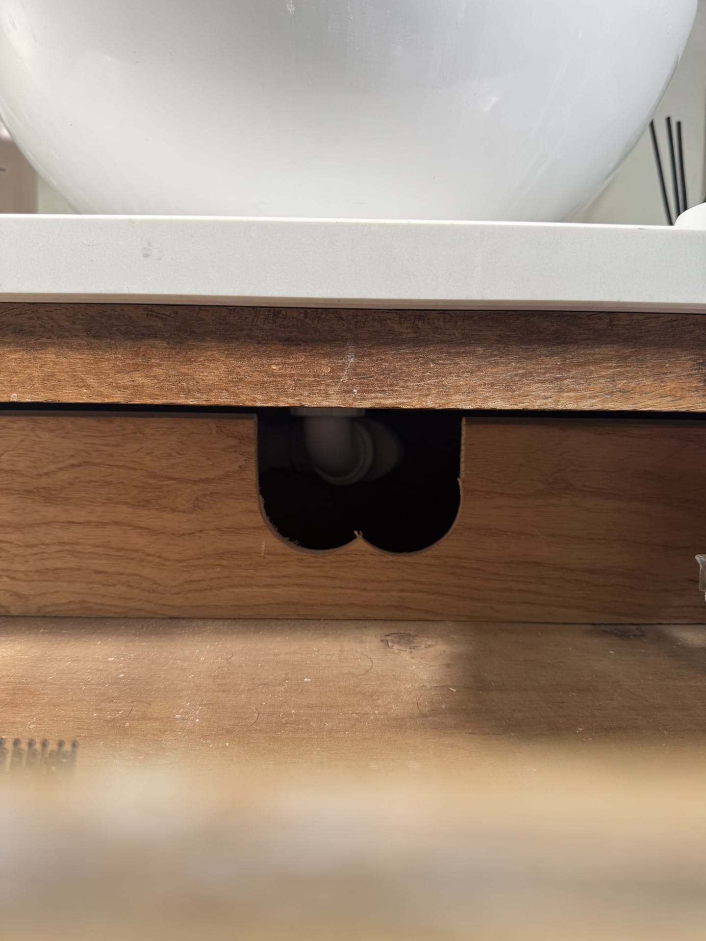 Since the waste pipe needed space, I cut a small section out of the drawer to allow it to close properly while accommodating the plumbing.