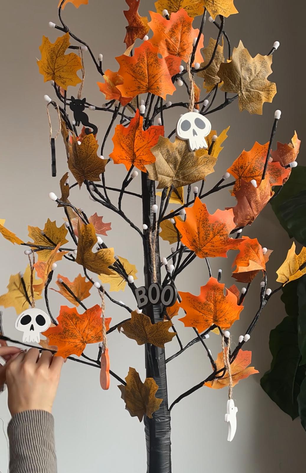 Bring out that black twig tree you’ve had tucked away. To give it an autumnal makeover, take orange and brown leaves from a garland and use a hot glue gun to attach them to the tree. This transforms it into a beautiful autumn tree that ties in perfectly with your Halloween print. Add some black, white, and orange wooden decorations to your tree. These small accents will enhance the Halloween vibe and make your tree look festive and fun.