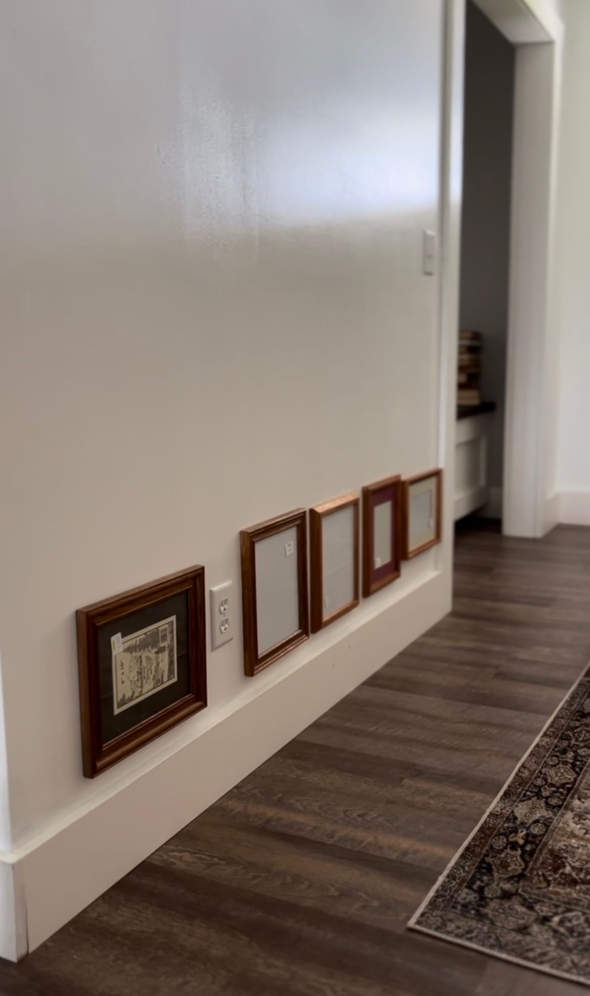 After a lot of careful thought for arrangements and then multiple searches around the house for my hammer when my kids would run off with it, I somehow brought the vision in my head to life. I had arranged my frames row by row until I had reached the ceiling. Then I wrapped frames around the bench cutout in my hallway, back down to the ground. In all, this took me a couple of hours to complete.