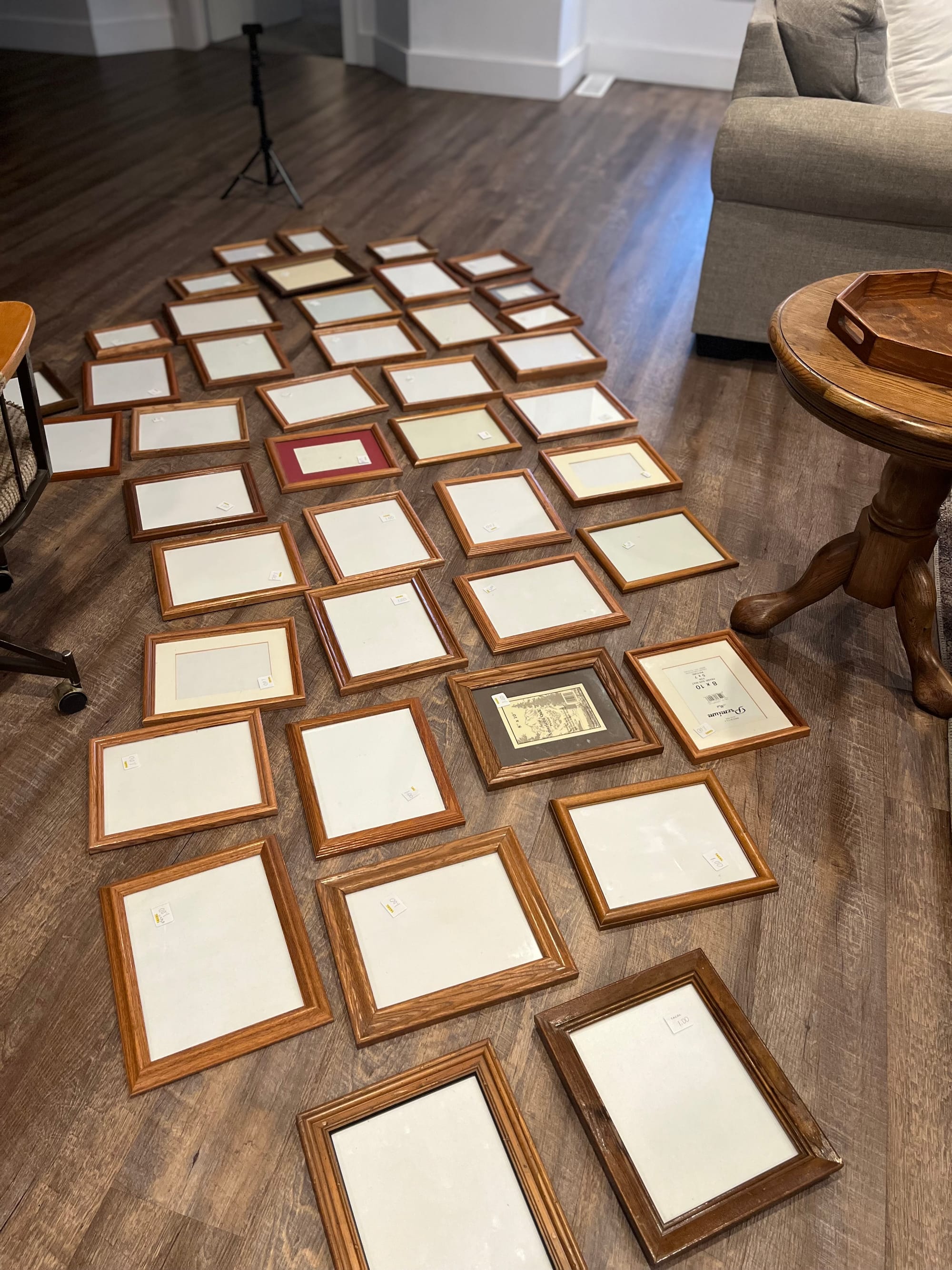 After being struck with inspiration, my next big task was to find enough frames to fill the entire wall. I made an hour road trip to my favorite thrift store of all time so that I could ransack their frame section.