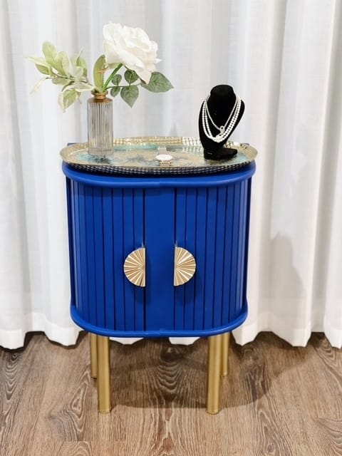 I wanted a jewelry cabinet, and I didn't want just any old jewelry cabinet I wanted one on legs. Could I find one! So I set about making my very own. Using two Kmart bread bins and beautiful gold handles I spray the legs gold and attached them...