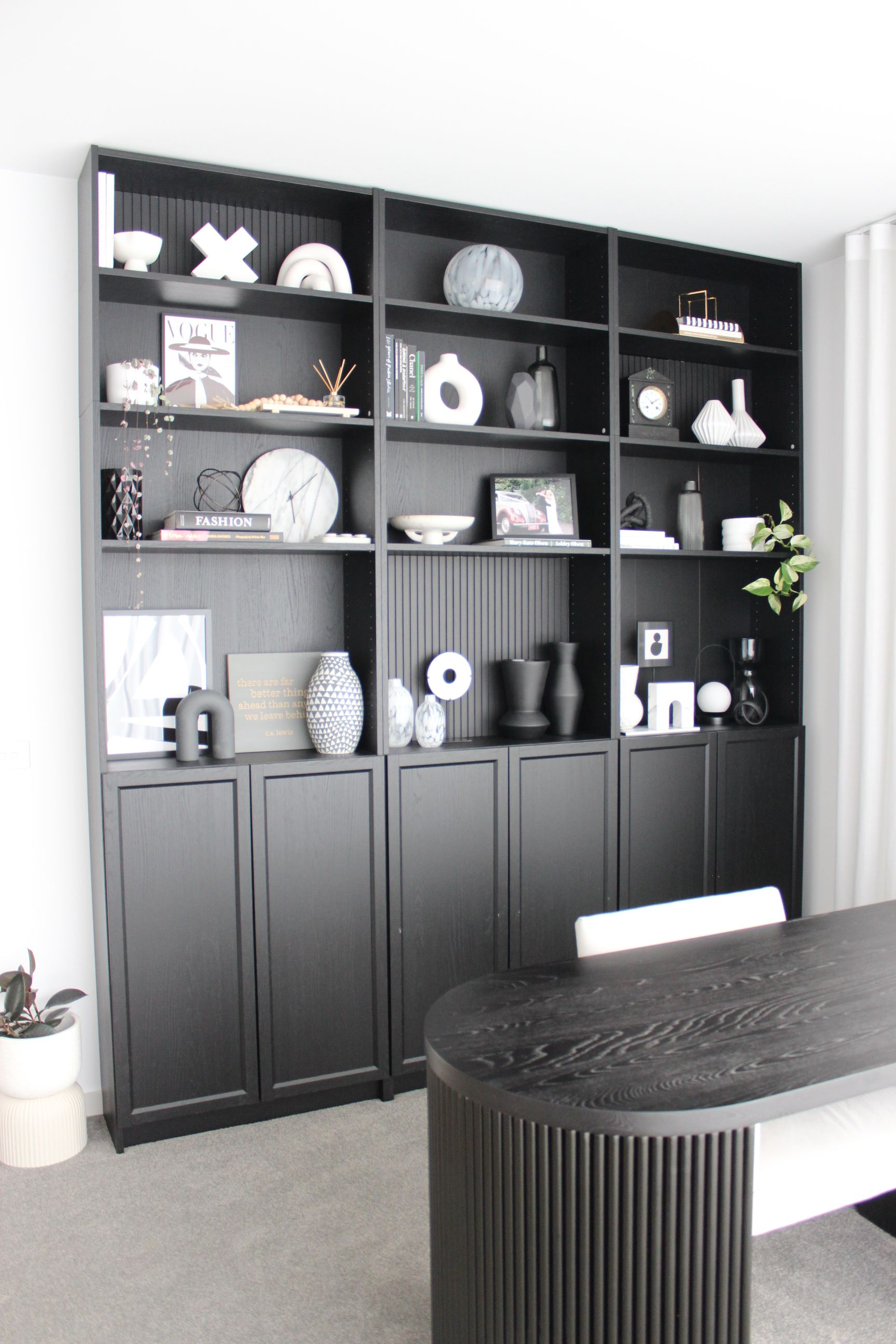 We instead ended up choosing IKEA Billy bookcases and implemented three specific 'hacks' to create the perfect bespoke set up for our space.