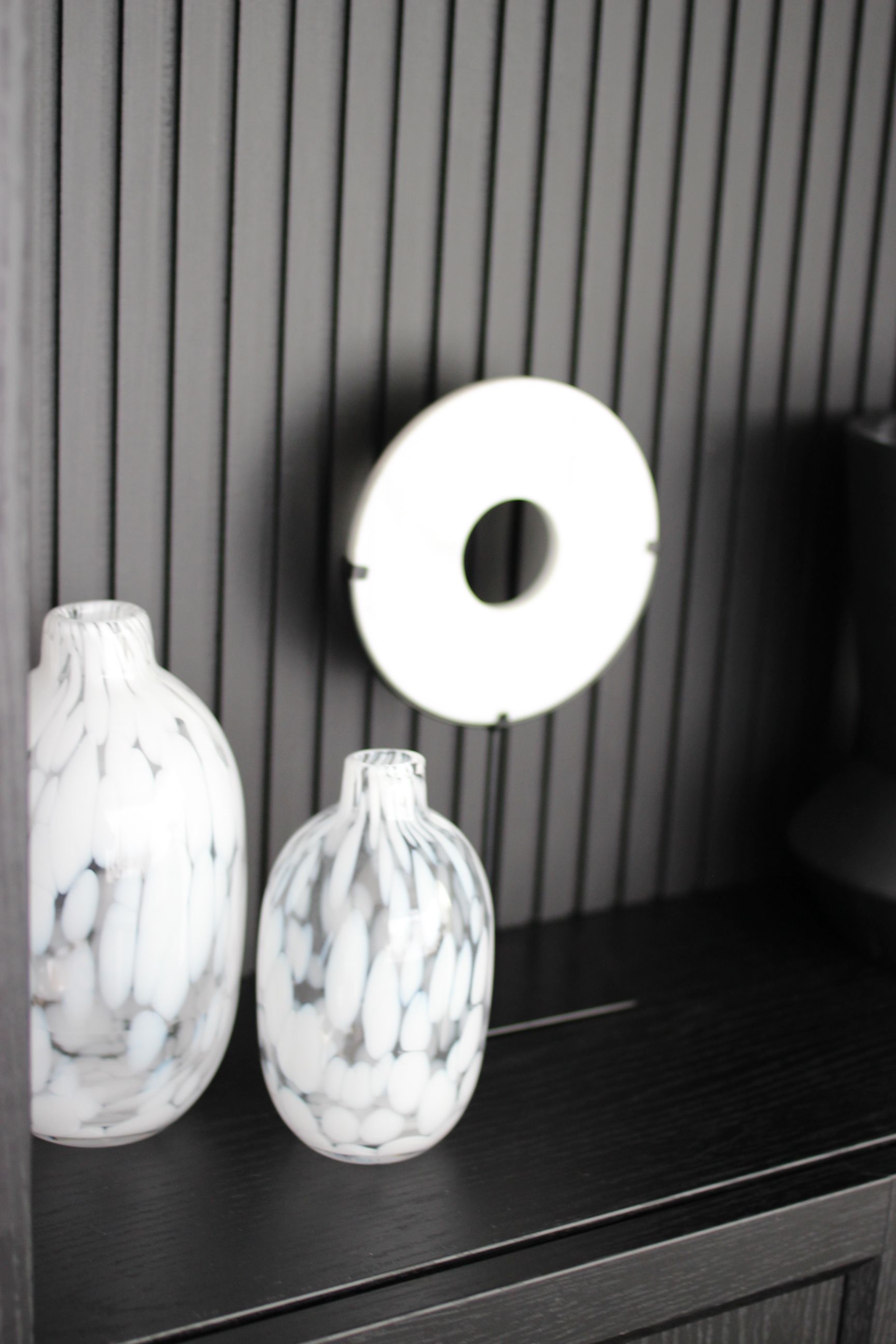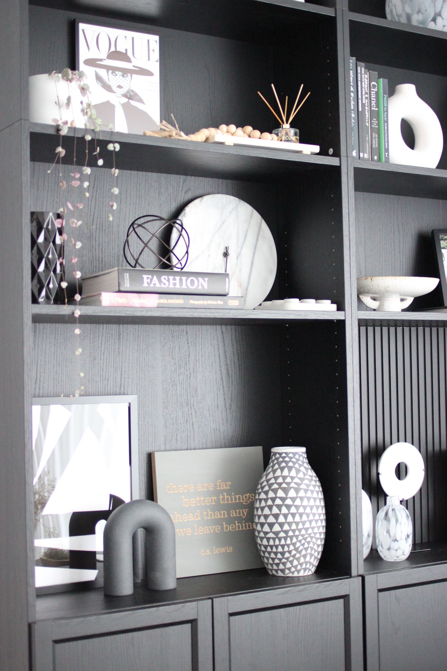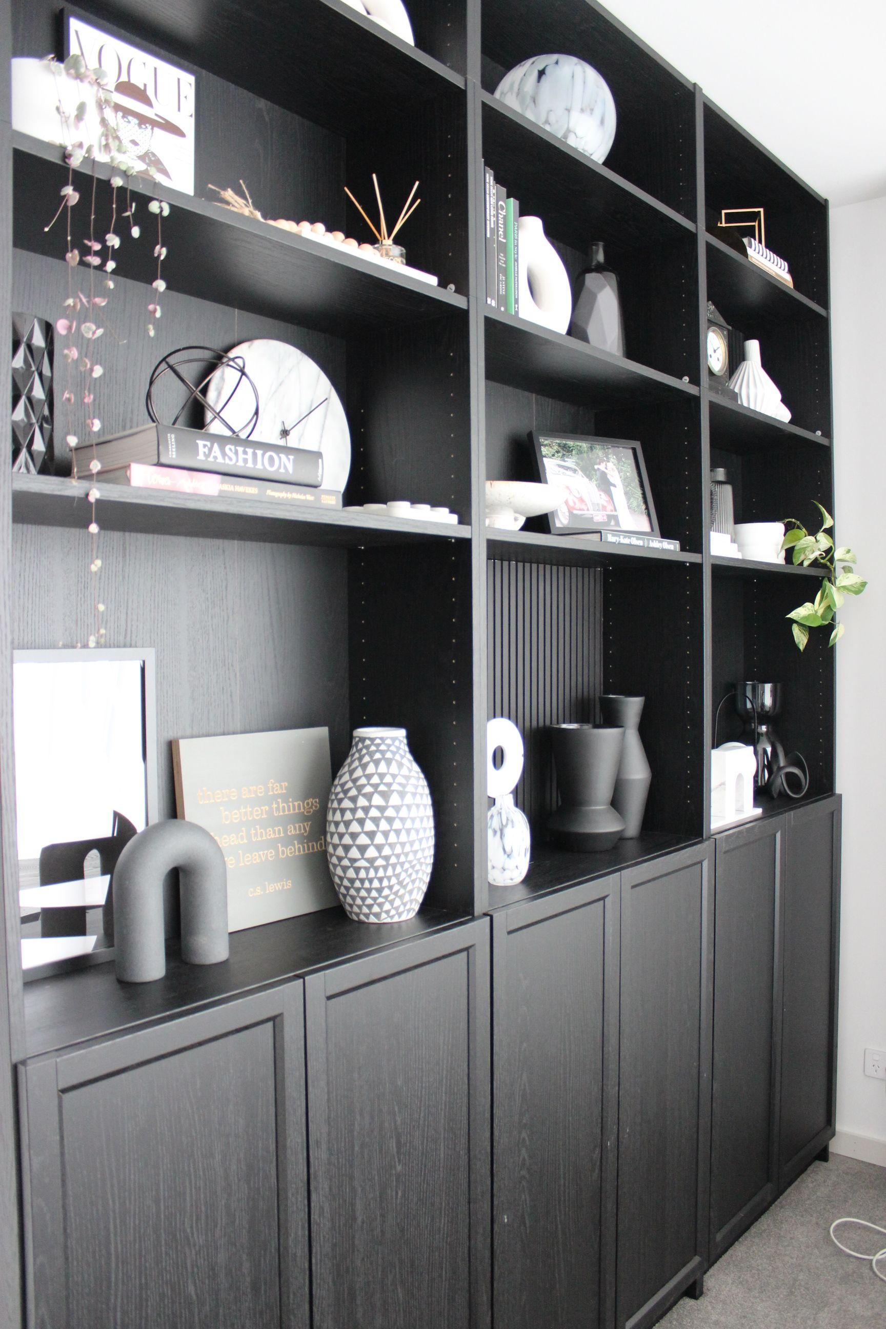 - Insert a bespoke backing into some of the sections. We used a 25mm batten panel/sheet which we painted black and cut to size in three of the shelving sections - the asymmetry also makes it more visually interesting. These were secured to the back with adhesive velcro strips so that if we want to change the look down the track, we haven't damaged the bookcase.