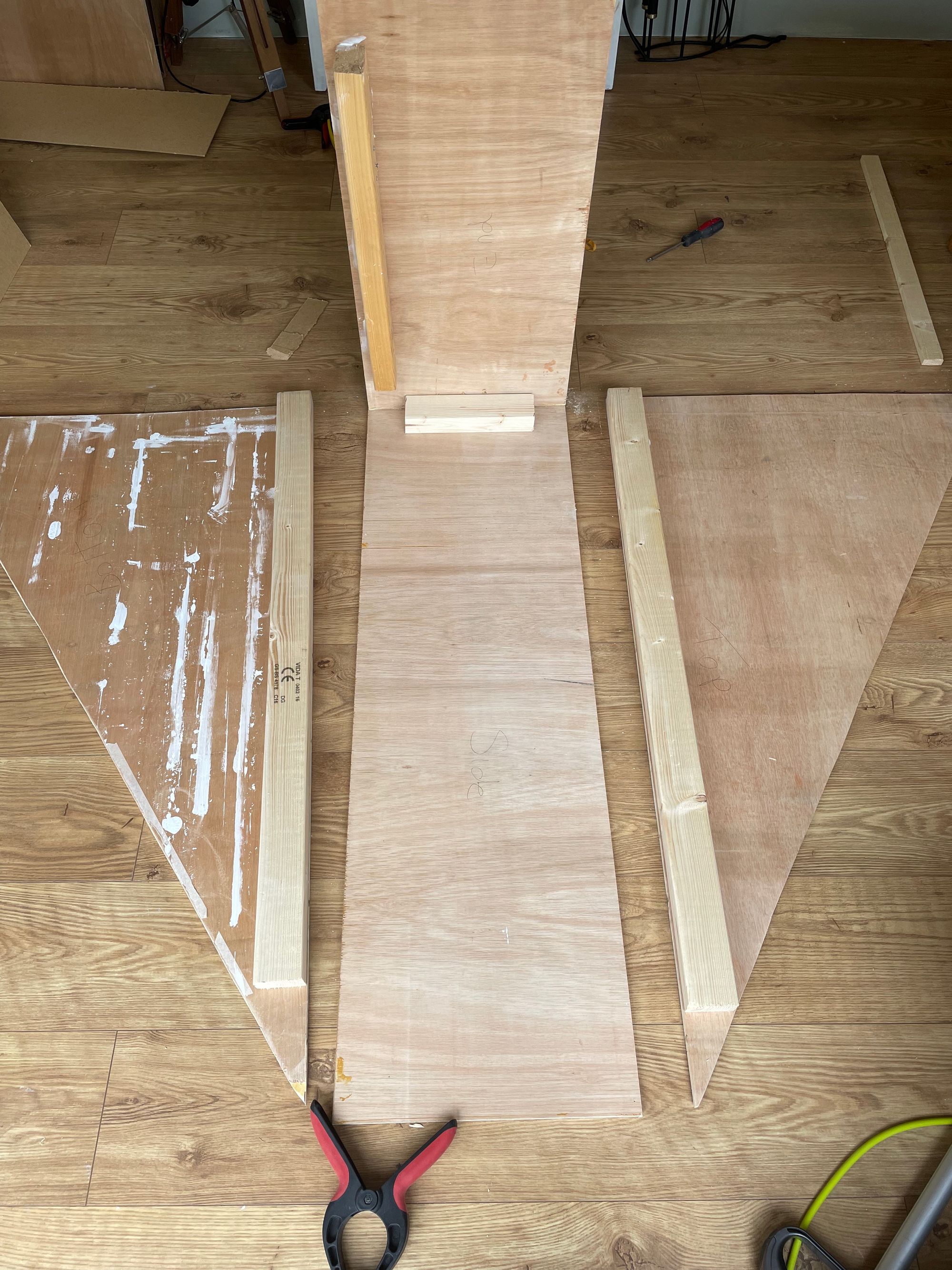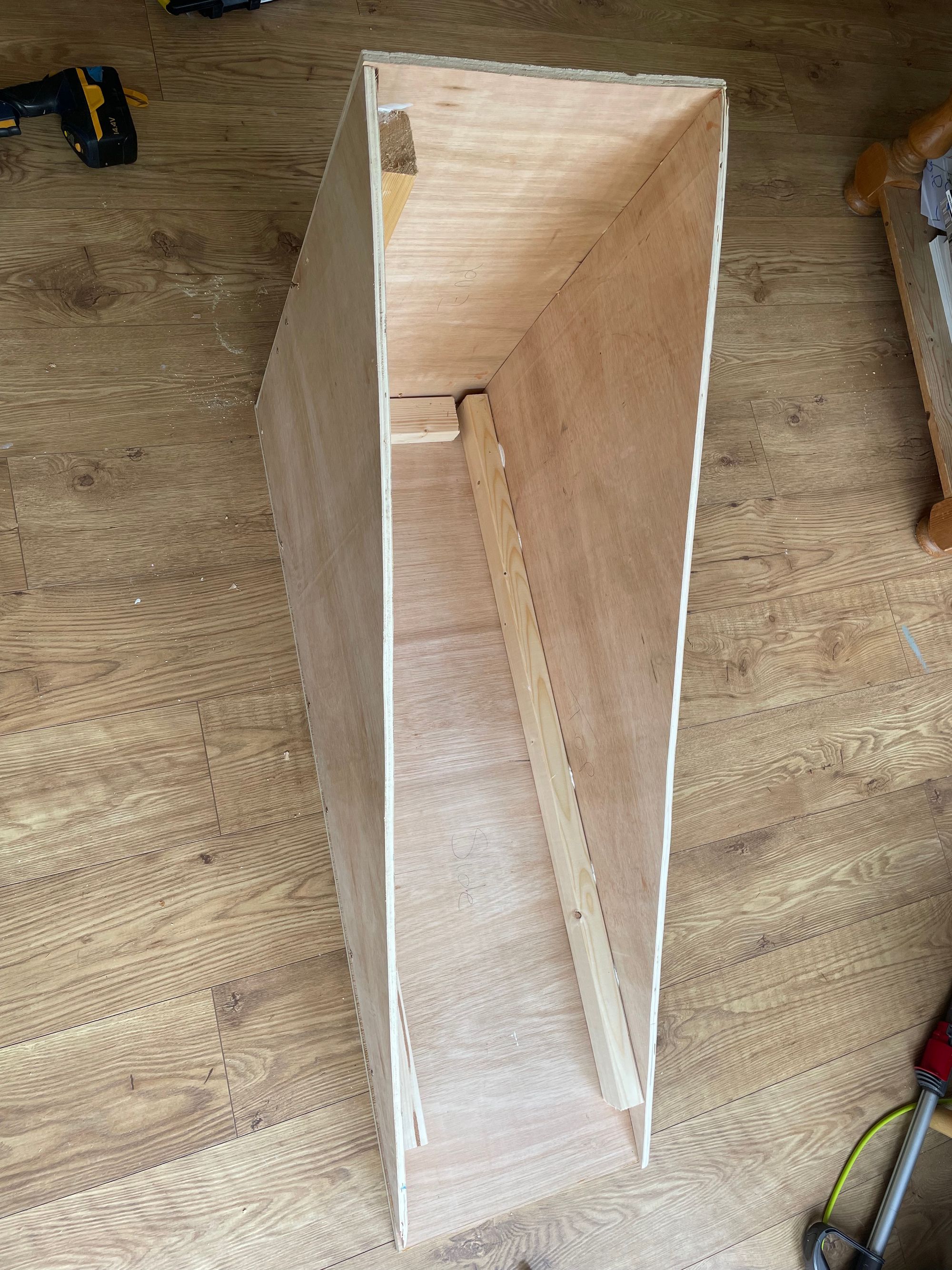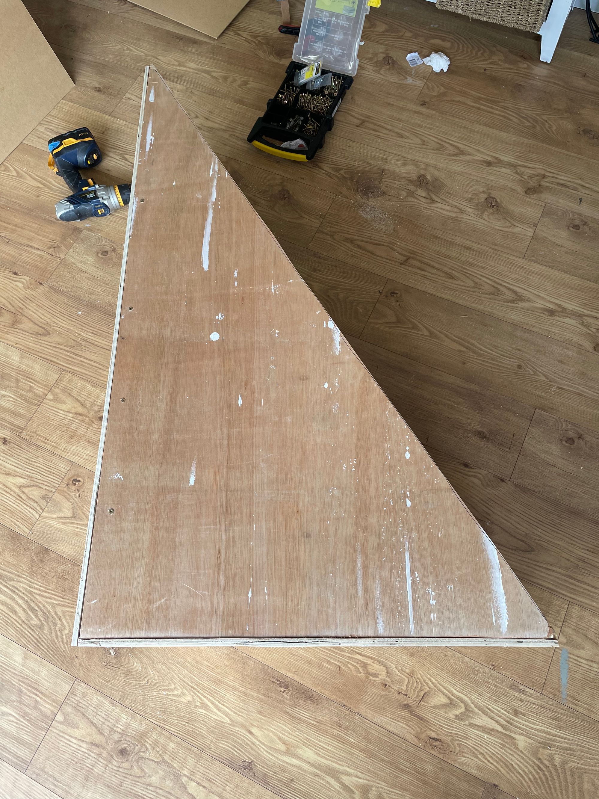 Attach a sturdy piece of constructional timber to the side of the main pieces using screws and glue to add extra stability. Screw the adjoining pieces into the timber supports starting with the right-angled side pieces and followed by the top and bottom triangles of the coffee table. Use small screws to attach the edges of the plywood together. Attach the longest side last, using grab adhesive and panel pins to attach it since it's much thinner than the rest of the structure and is made of flexible MDF.