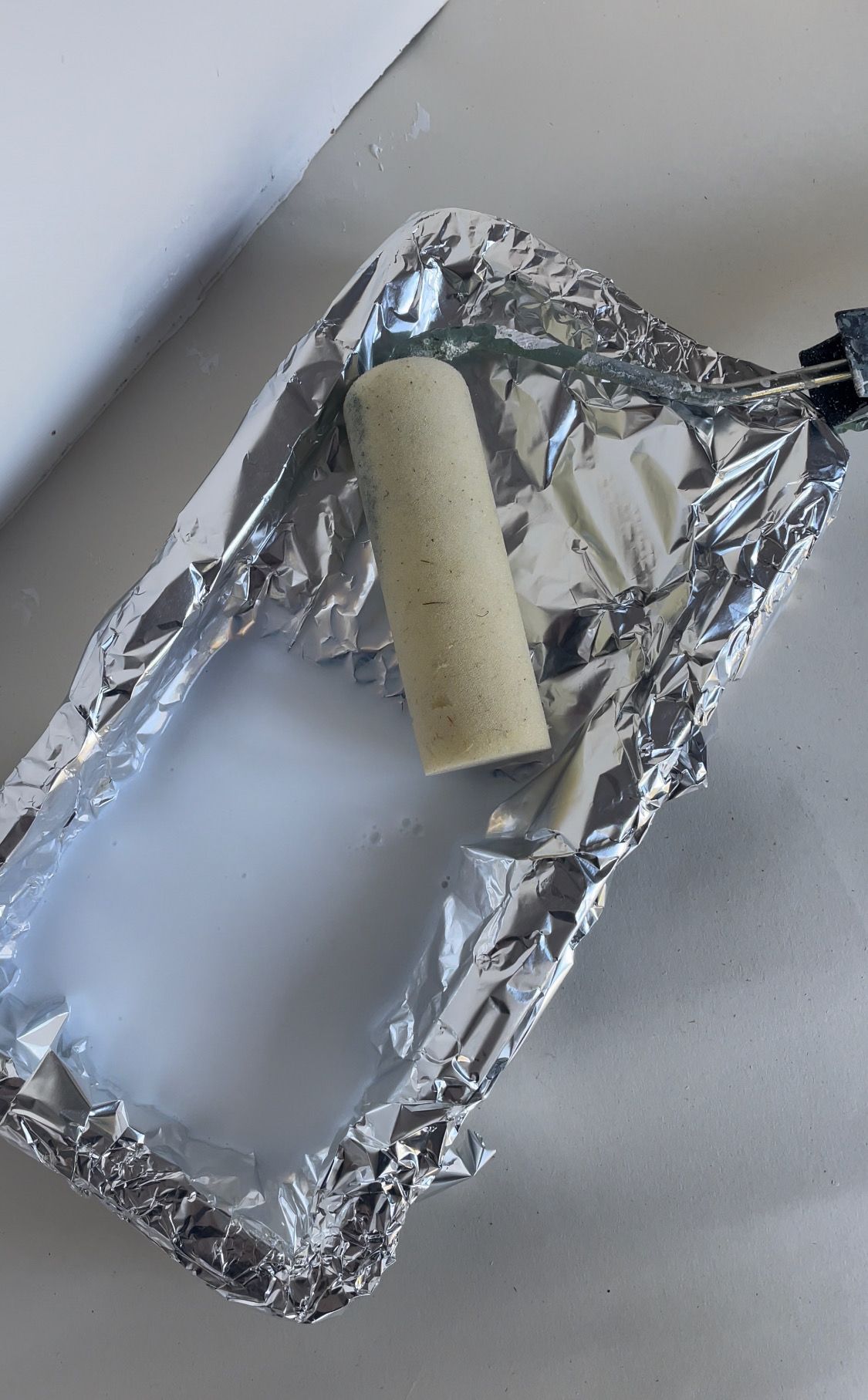 Use an off-white polished concrete micro-cement kit from concretelab.co.uk or any brand of your choice. Priming the base material is crucial to ensure the micro-cement adheres well. Pour the primer into a roller tray and use a sponge roller to apply a generous coat to the coffee table. Leave the primer to go tacky for approximately 30 minutes.