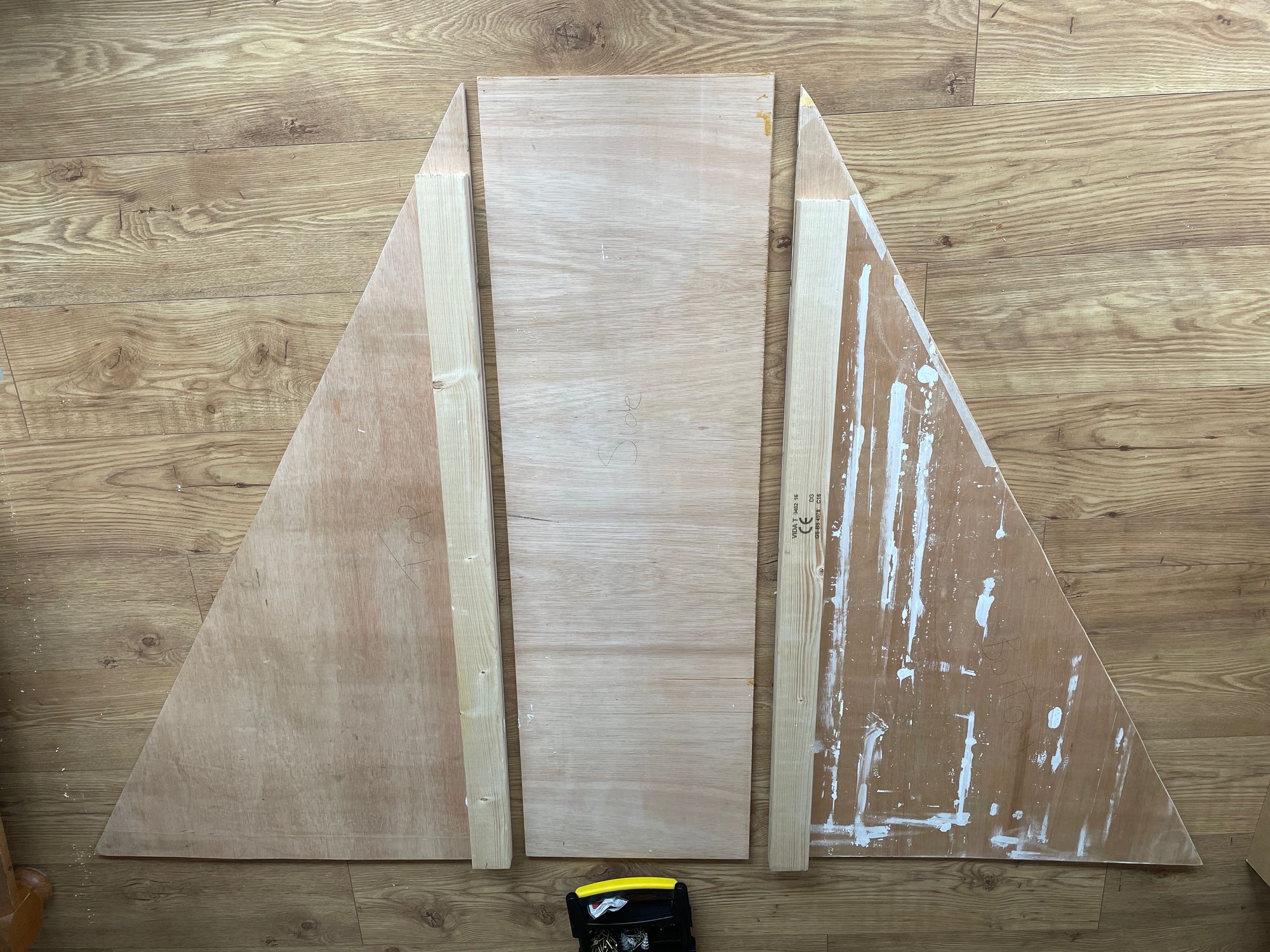 For this project, you can use any type of wood that you prefer. I used leftover plywood from a previous project. I cut the plywood sheet in half diagonally to create a right-angled triangle since she wanted a triangle-shaped coffee table. If you don't have any leftover wood, you can buy one and decide on your preferred size beforehand.
