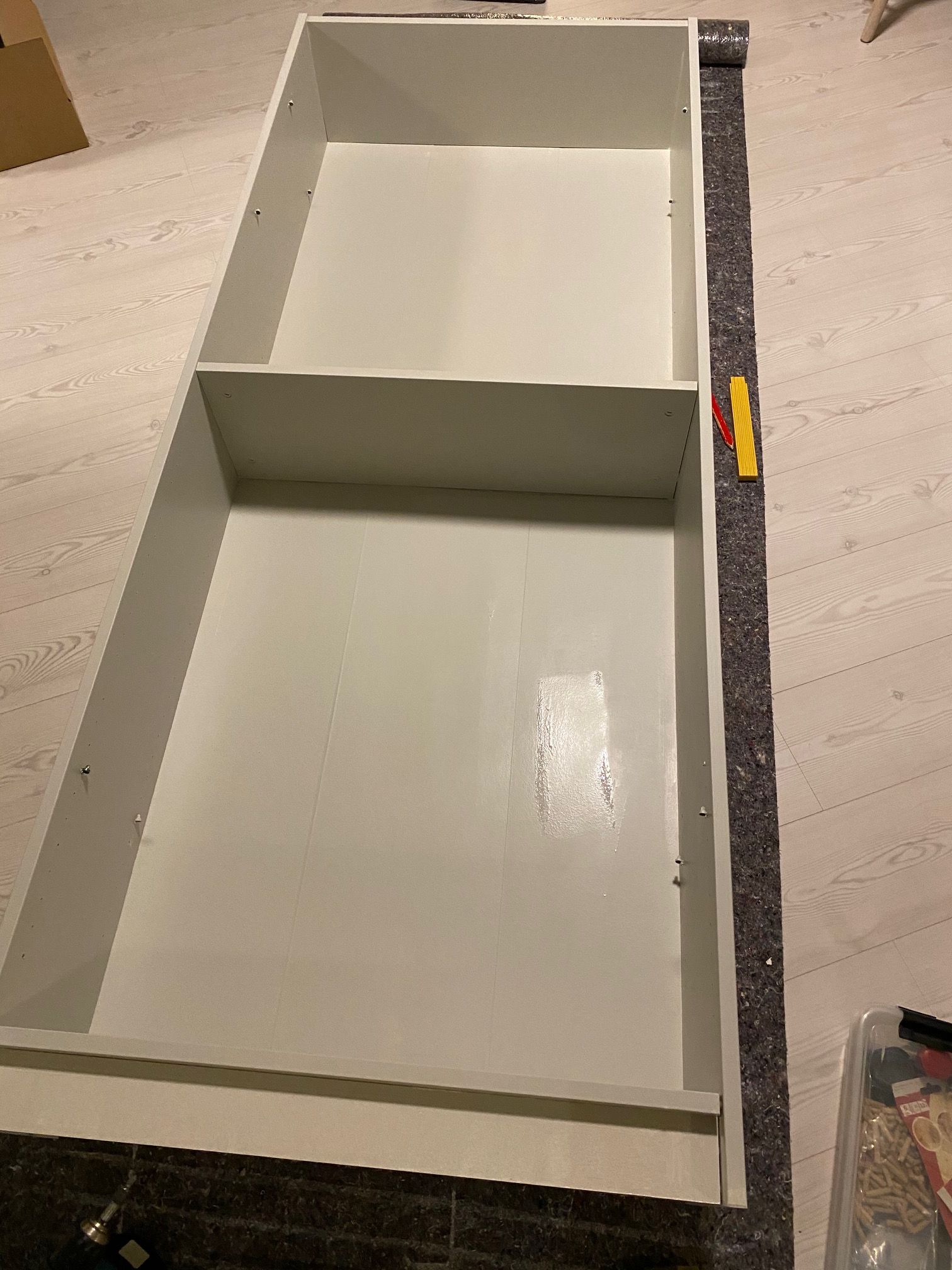 I first put the shelves in place and painted everything grey, which is the color I wanted, before painting the shelves.