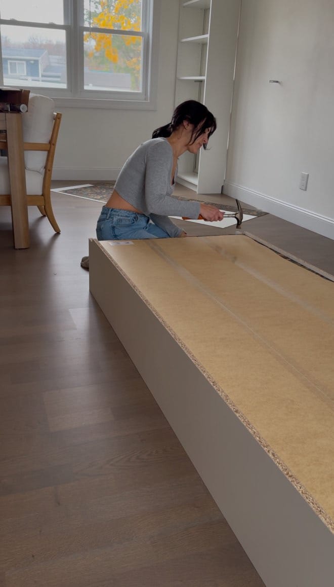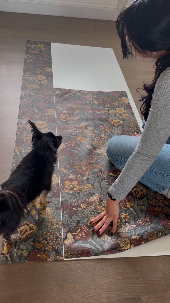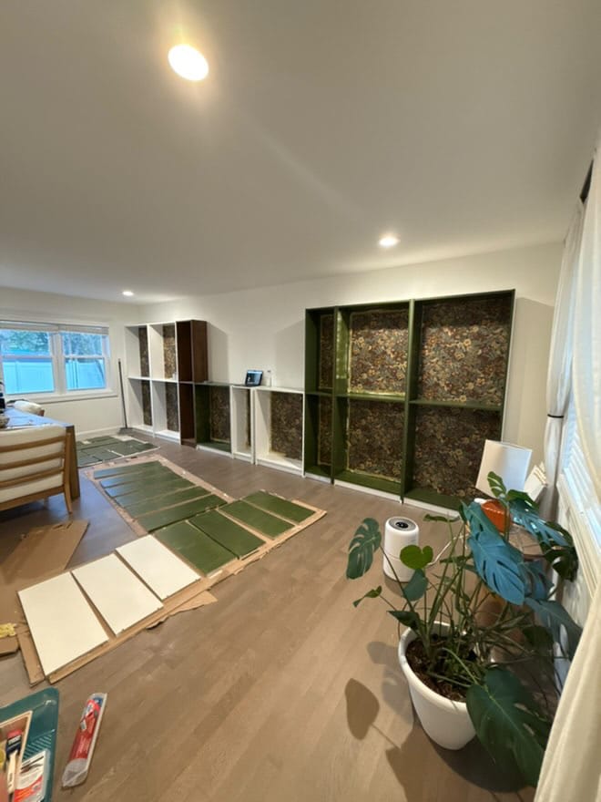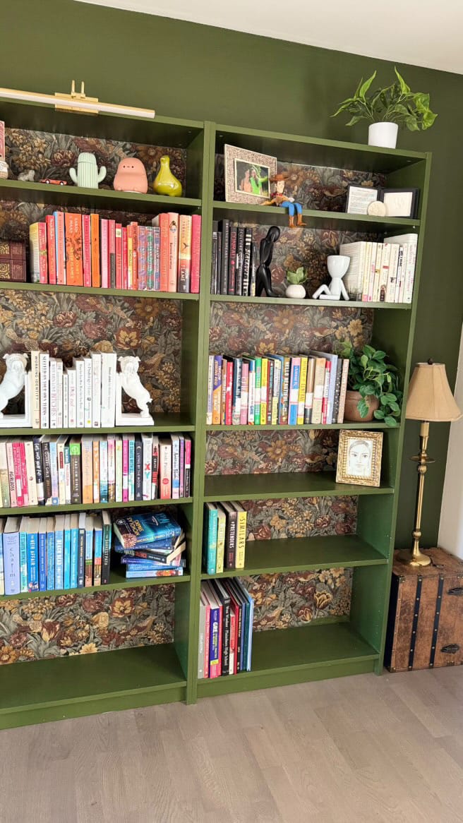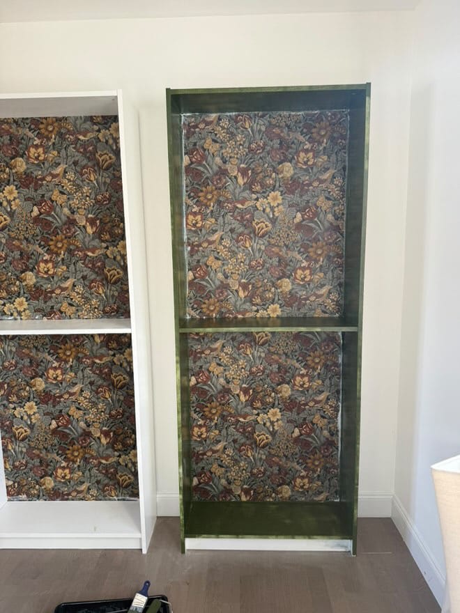 Once I had all the pieces, I started by assembling the bookcases. After that, I added wallpaper to the back panels to give the shelves a pop of personality.