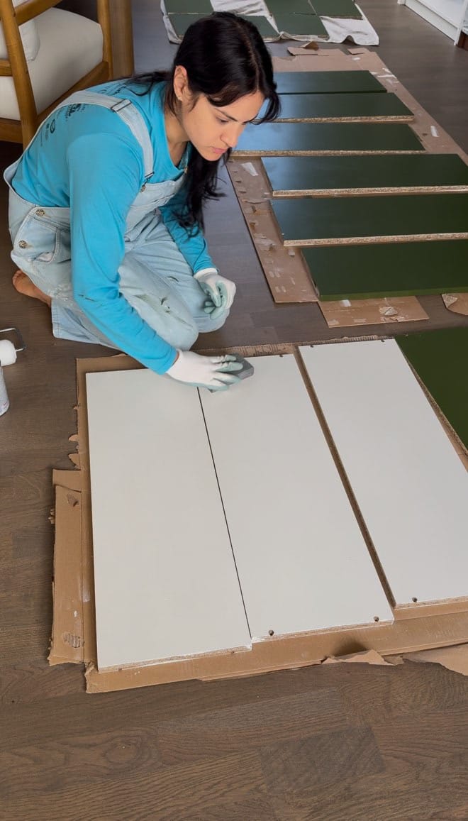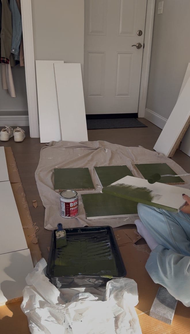 - Priming: I used BIN shellac-based primer, which creates the perfect base for painting. Apply the primer with a paintbrush (not a roller) to create a slightly rough texture. After the first coat dries, sand it lightly, then apply a second coat and sand again.