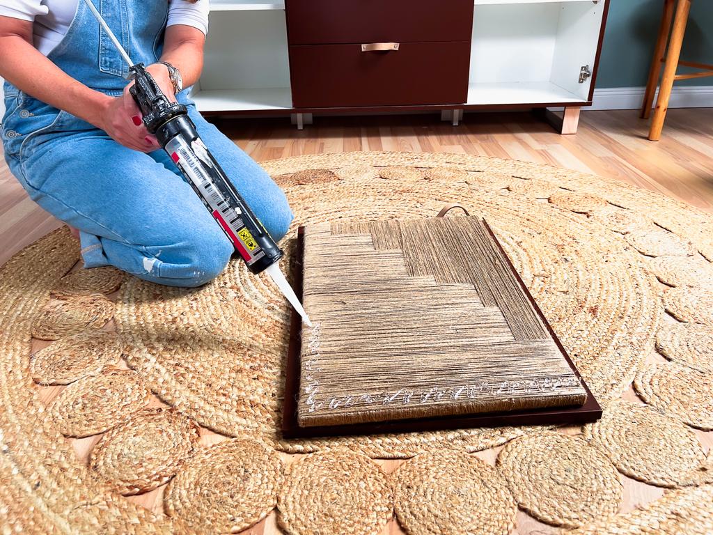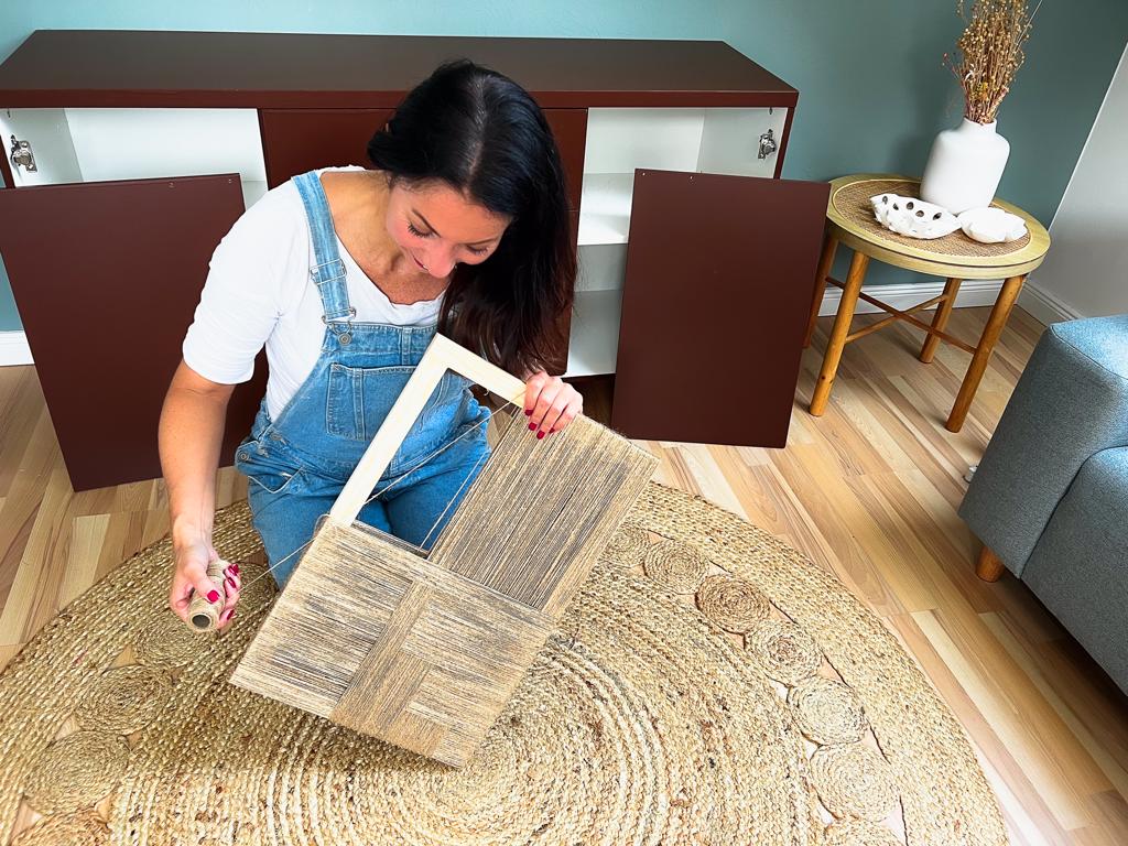 Now comes the fun part! Take the jute twine and wrap it around the wooden frame, alternating directions for a textured and visually appealing effect. This step adds a rustic and charming element to the sideboard.