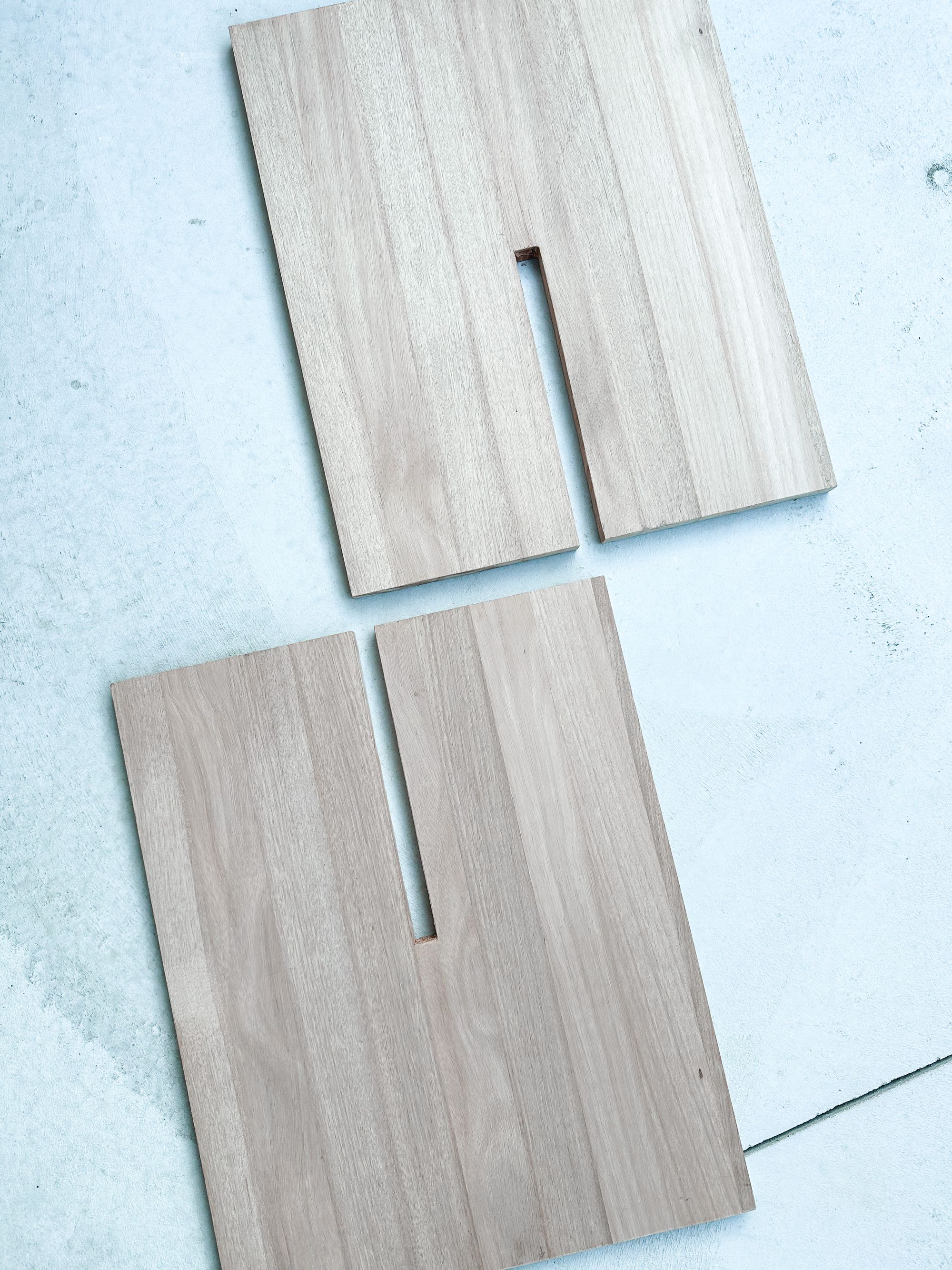 2- Cut a slot into the two leg pieces with a jigsaw. The cut should be 250mm deep and the same thickness as the piece of timber. (See image). This cut allows the two legs to slot together to form an X.