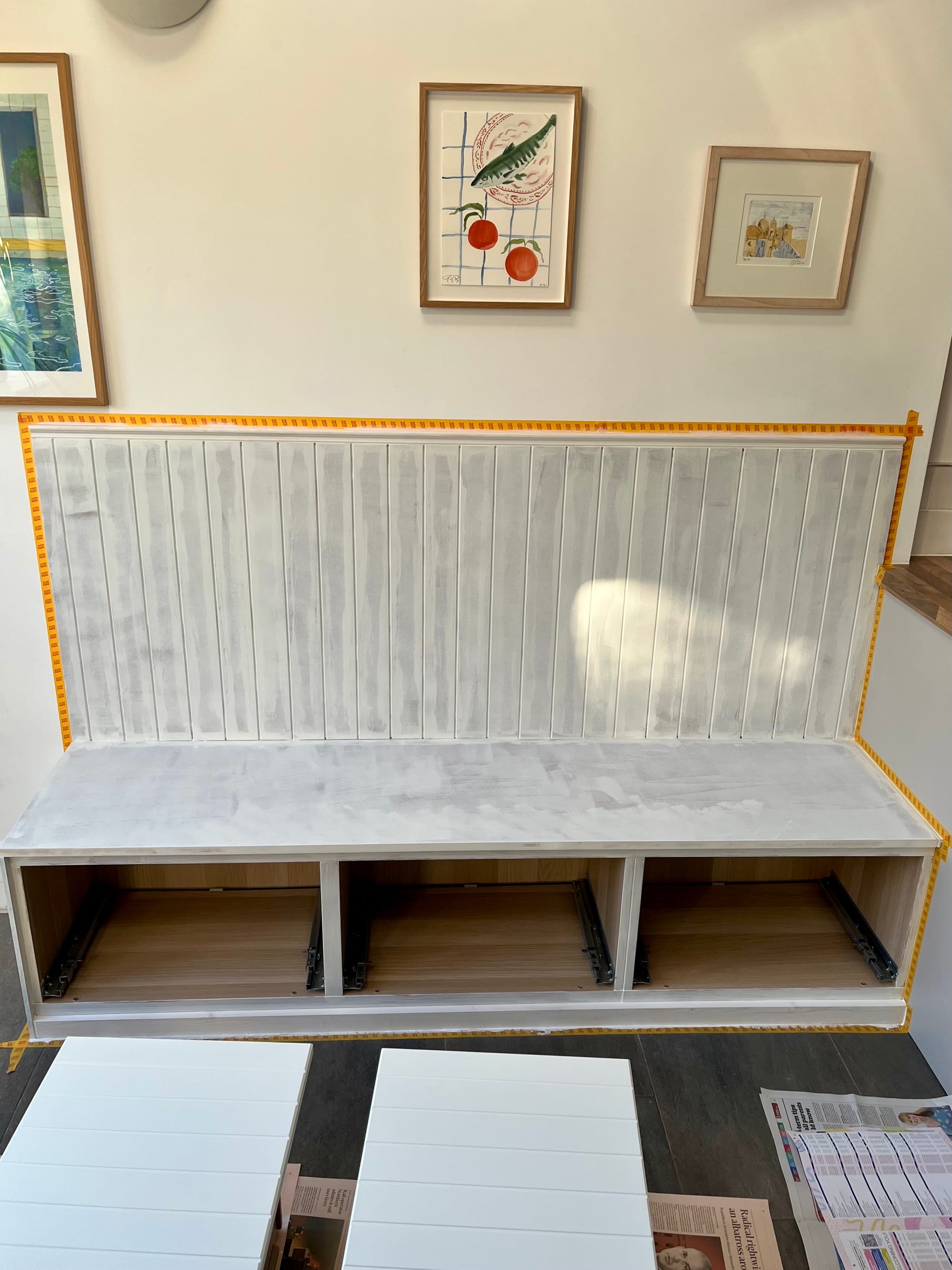 Finally the fun part! Once the primer had cured, I then painted everything using eggshell paint. I did 3 coats and used a mixture of brush and roller to get a smooth finish. Again, we let the paint cure before we started using the bench, to help minimise the risk of chipping.