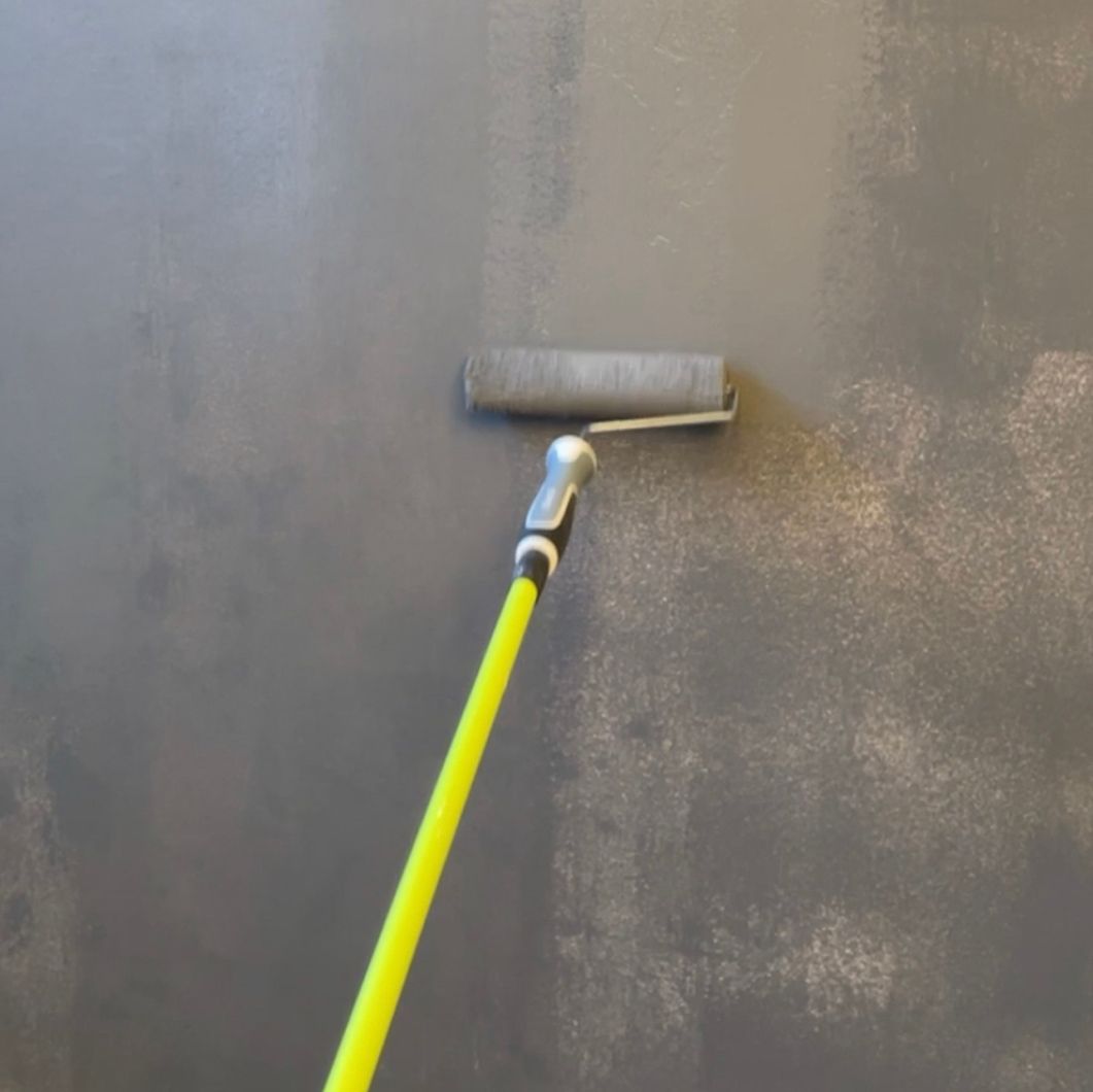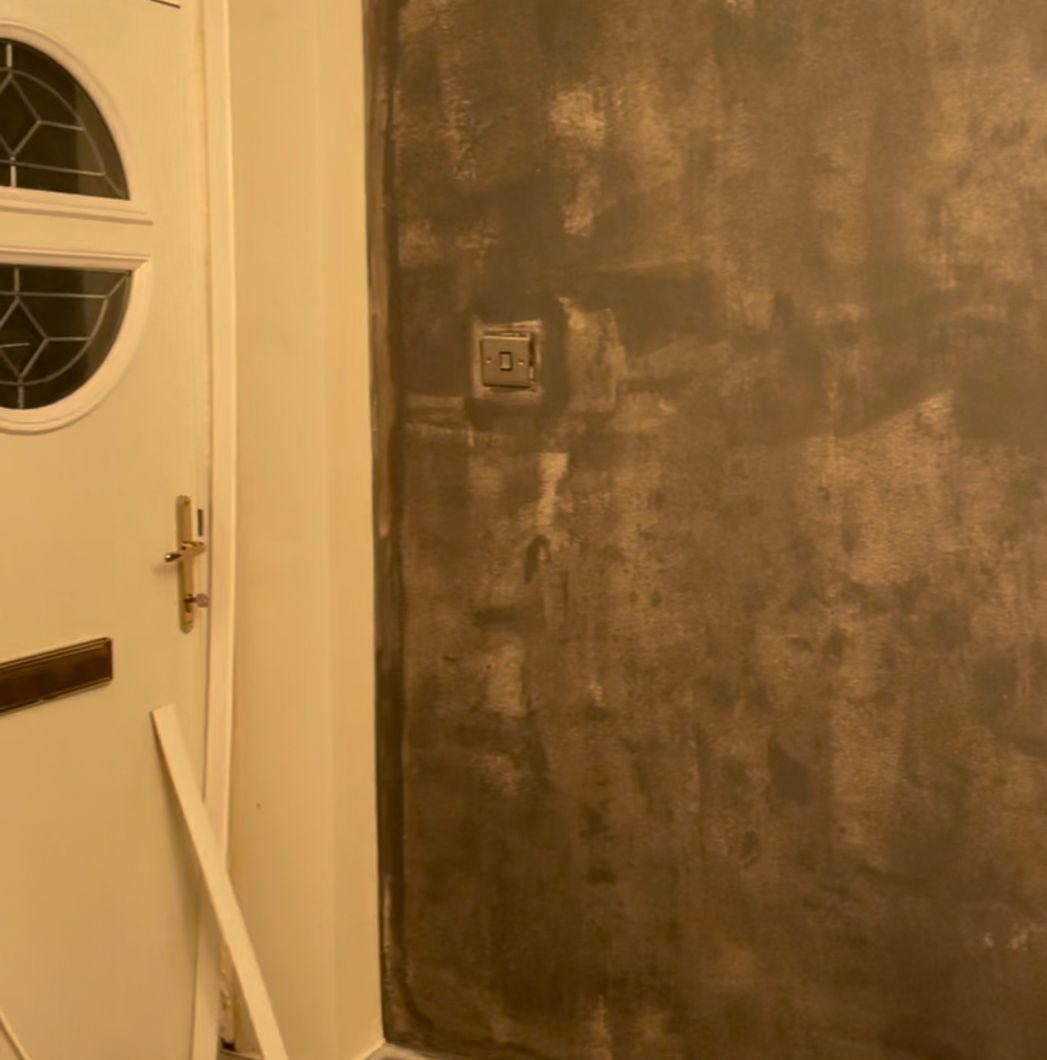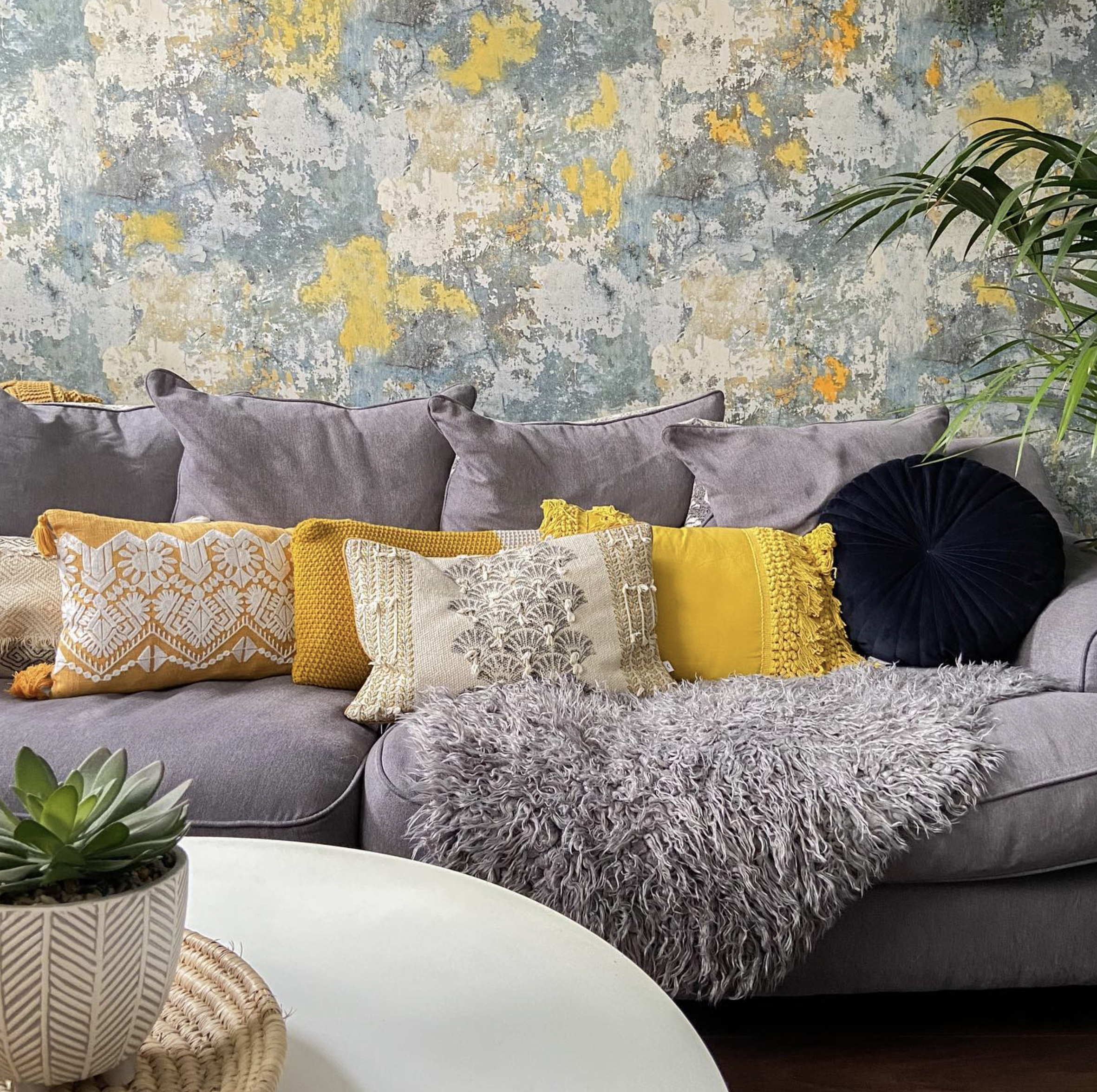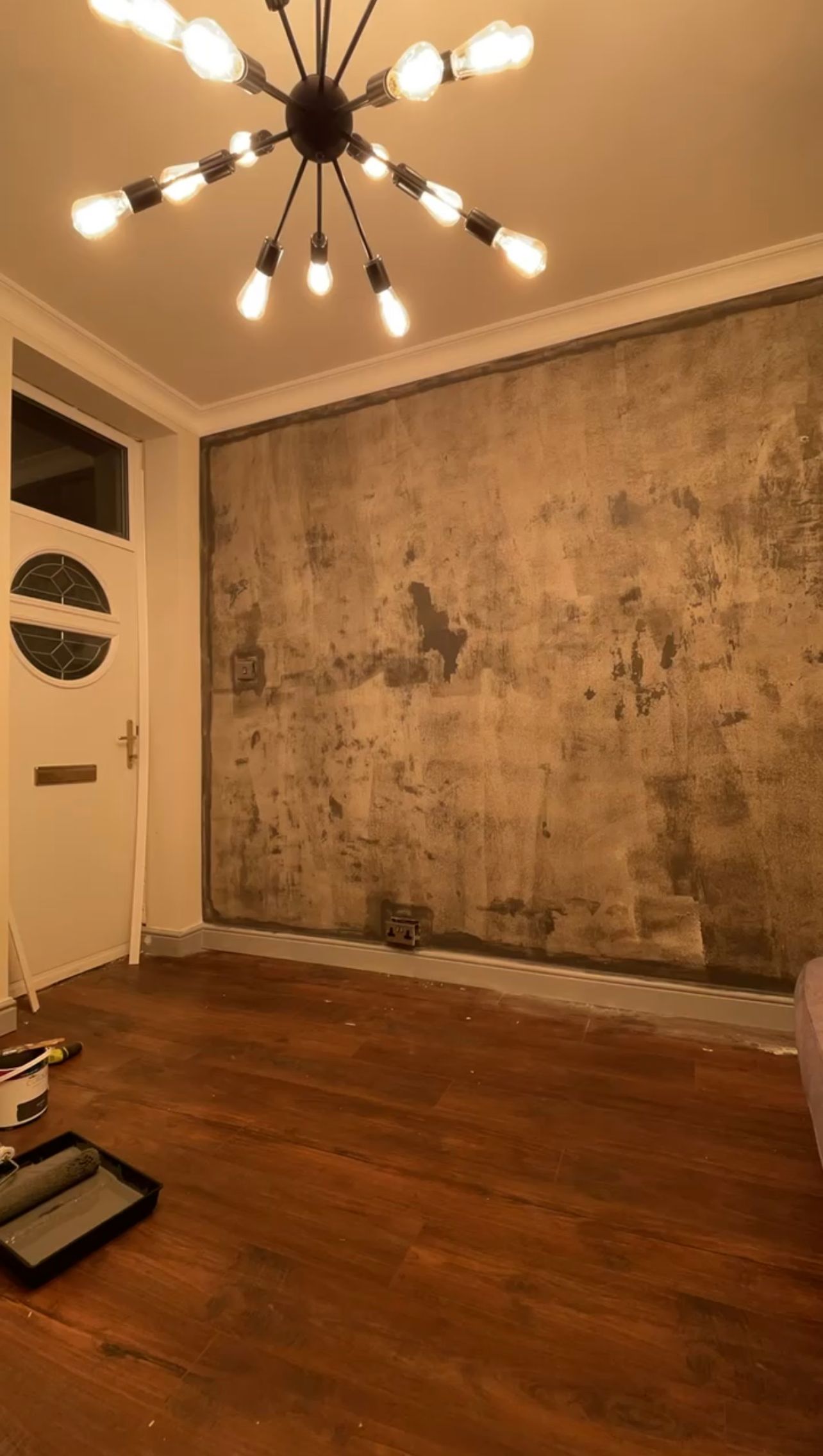 I have always loved the concrete effect but the simple wallpapers always seems just a repeat pattern; which I originally had in this room before and the murals are too expensive. Here is the wallpaper I had, which I added some mustard paint to try and make it less of repetitive pattern.