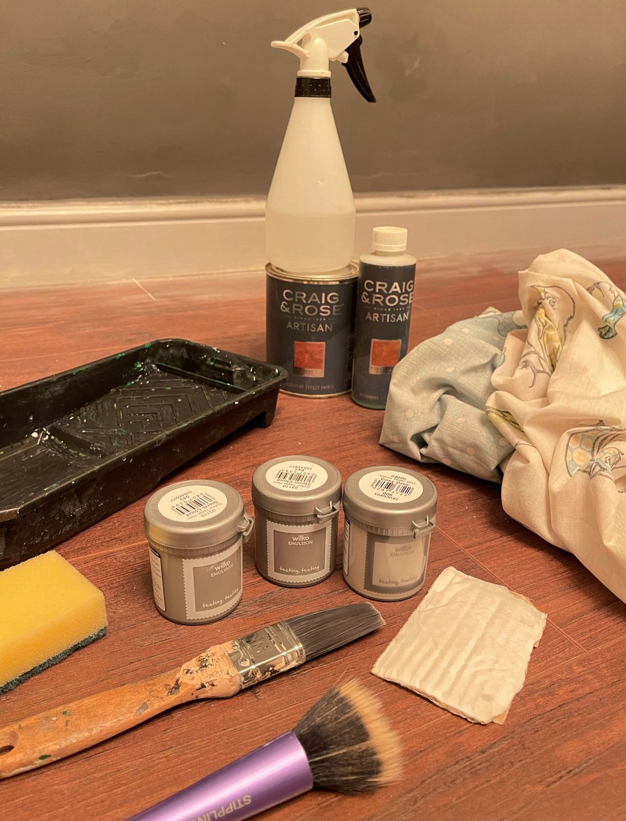 As the was experimental I didn't know what would be best to create the effect I was looking for. So I bought a few testers, different greys that would complement the base colour. A few brushes including a old makeover brush, a sponge, old rag, water spray bottle and some rust paint.