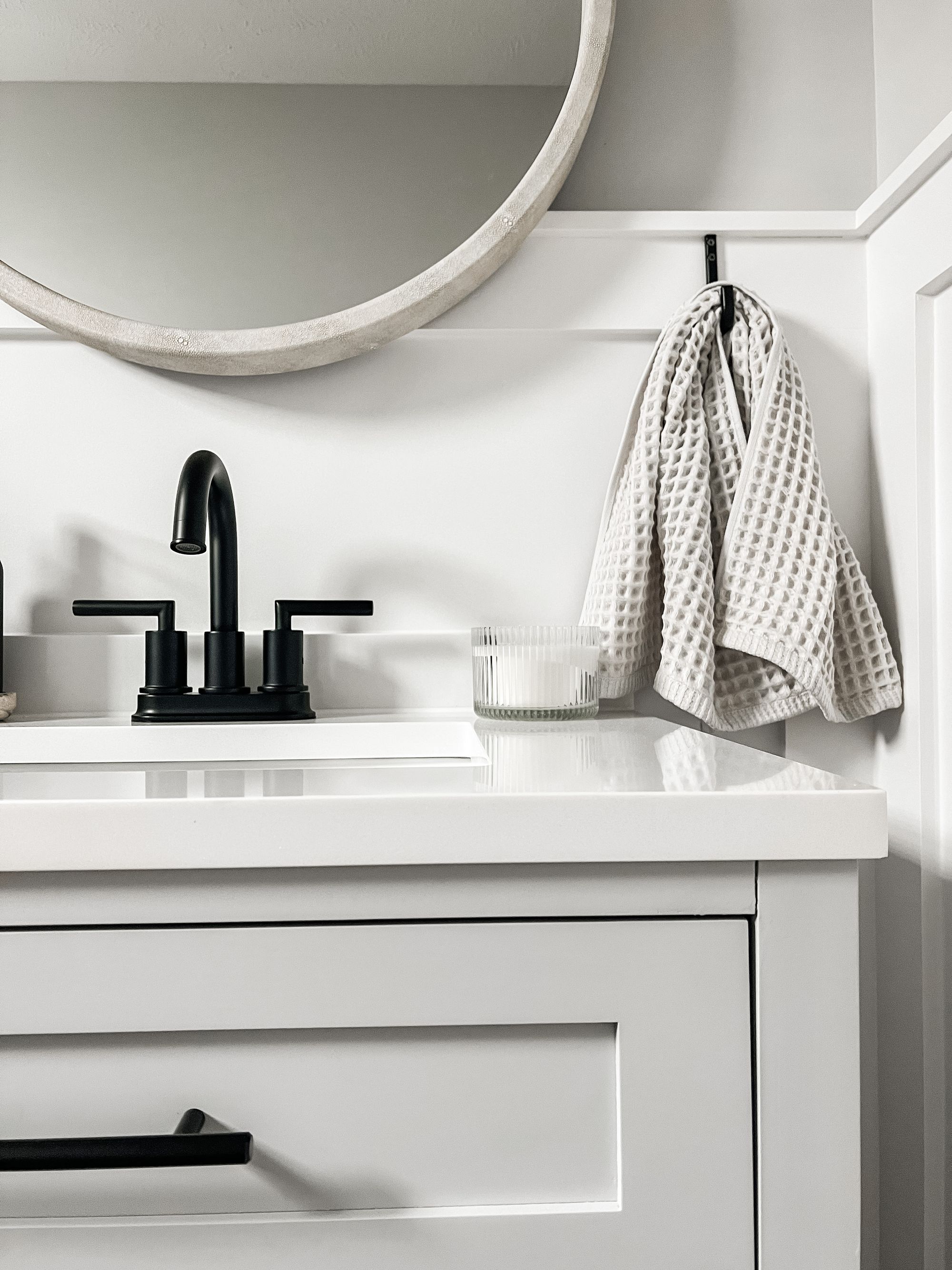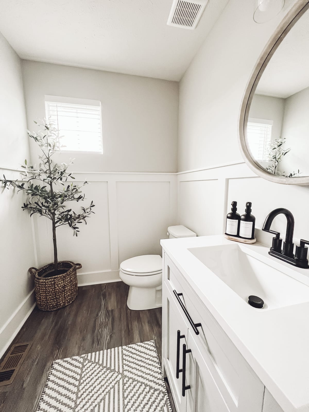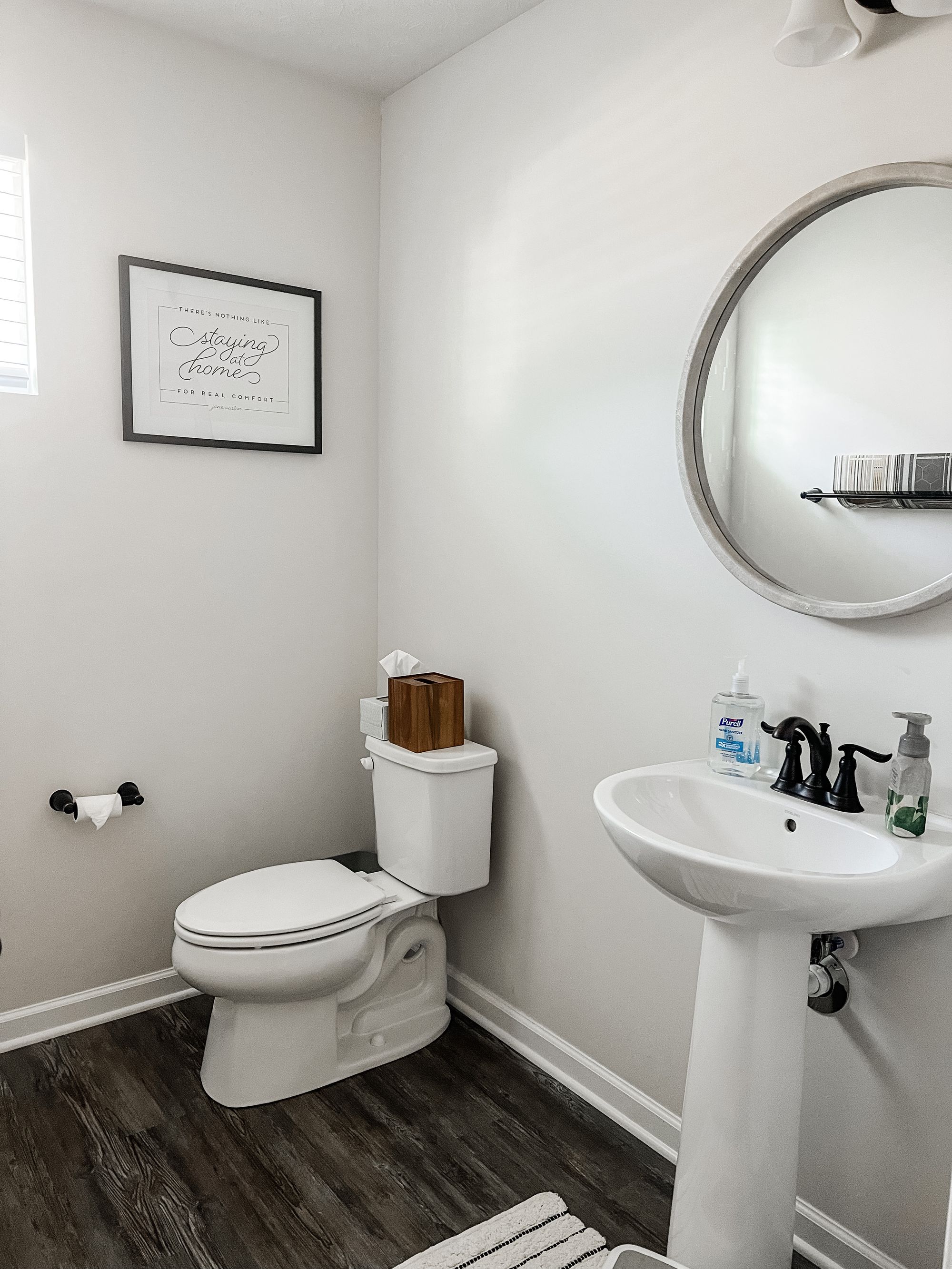We are big on the "builder grade to upgrade" motto, we purchased our house in 2020, we built it but opted for many builder grade options so we could do what we wanted in the most cost effective way. Our half bathroom is the MOST builder grade room in our house and now its one of my FAVORITE DIYs we have completed.