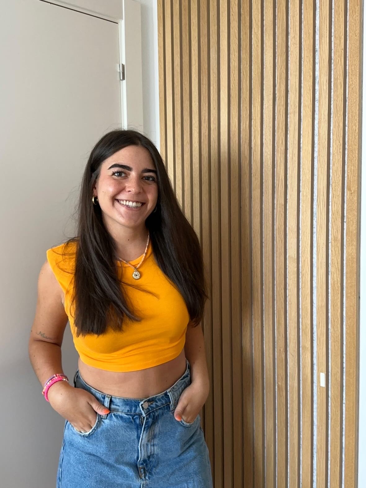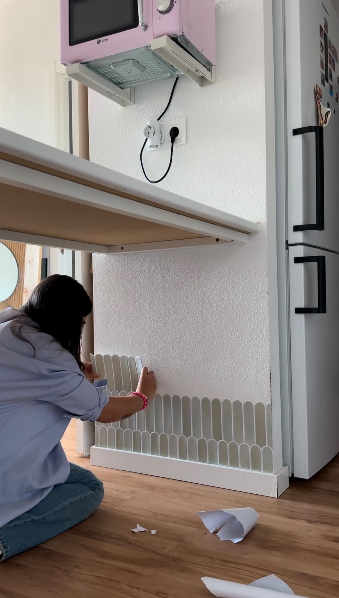 The first thing I did was stick the adhesive tiles on the wall. They are an ideal solution because they are not only easy to clean but also aesthetic. I cut them to the exact size of the wall so they would fit perfectly.