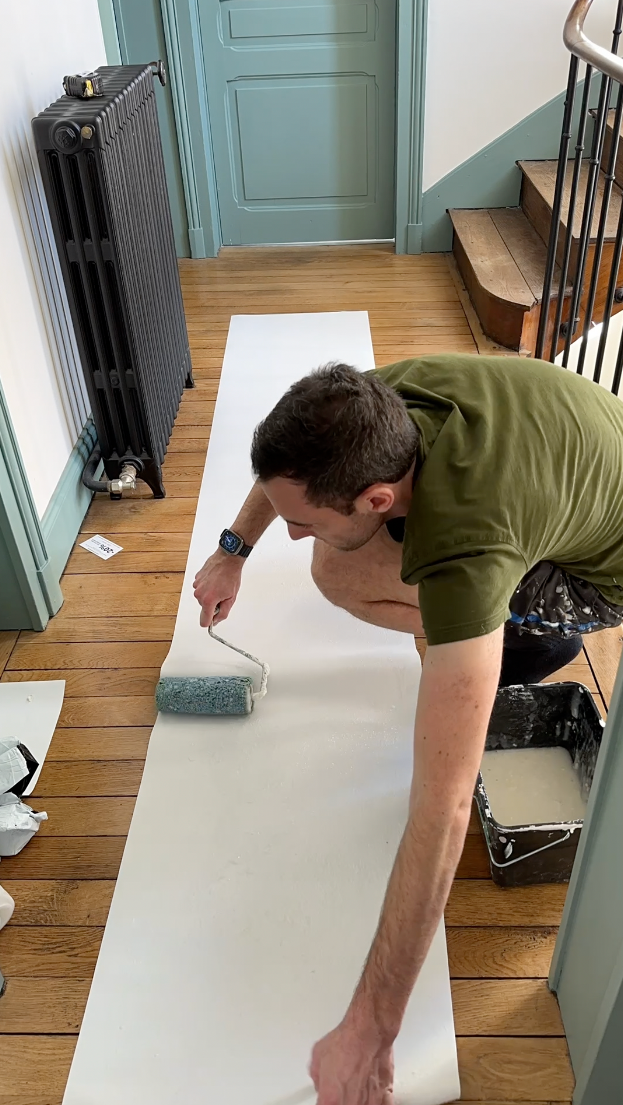 We went with the method of applying glue to both the wall and the back of the wallpaper. This helps everything stick well and avoids bubbles or peeling later on.