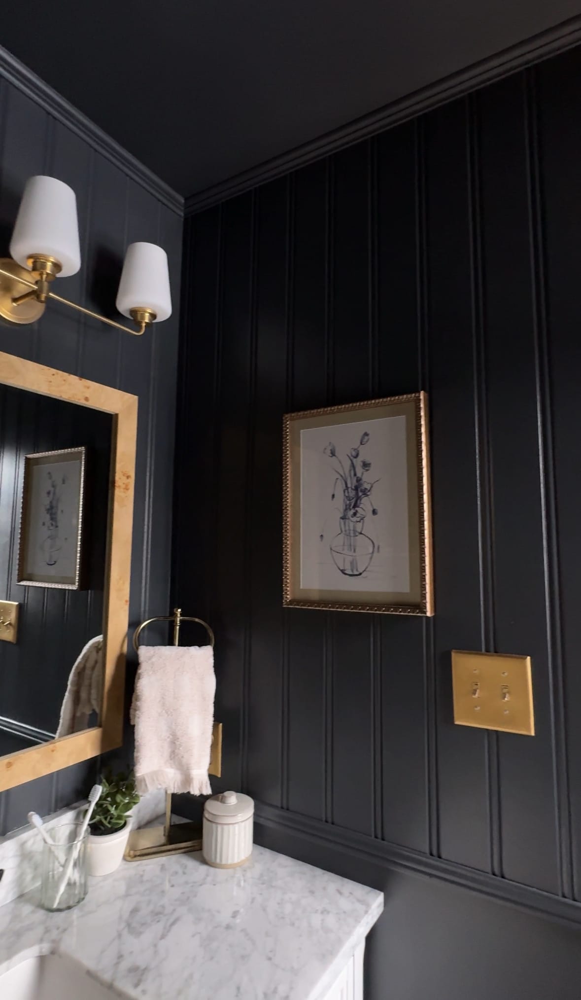 After transforming our bathroom with a deep, moody paint color, the space exuded high-end elegance—except for the stark white plastic switch plates and outlet covers that stood out in the worst way. I searched for stylish gold alternatives but found them to be surprisingly expensive.