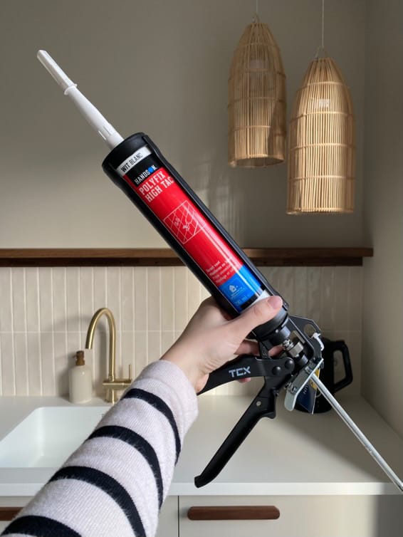 Instead of drilling, I used high tack sealant to attach the shelves, as there are pipes in my walls, making drilling risky. If you're sure there are no pipes in your wall, you can also drill holes and screw the shelves in place. Apply high tack sealant to the back of the boards (the side with two holes), then press the board firmly against the wall above the tiles. Hold it in place and allow the sealant to bond. Patience is key—let the sealant dry for 24 hours before using the shelves.