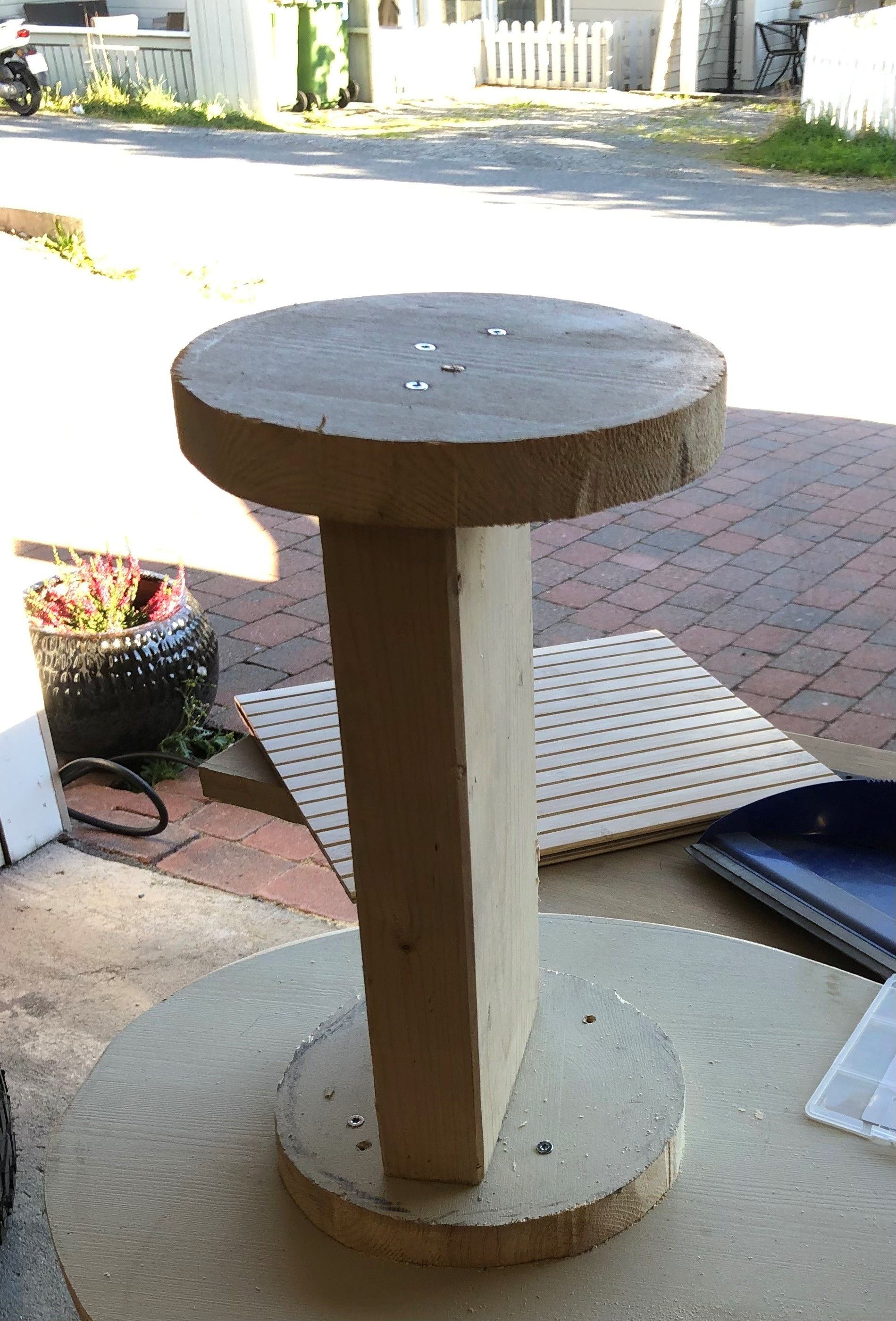 - Mount the two wheels and the 2x2 together with screws and glue, creating the inner structure of the table leg.