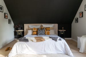 Too nice to throw away but too shabby to keep it like that! We upcycled the old nightstands, built new tabletops out of jenga and made them a perfect match with the new coloured wall.