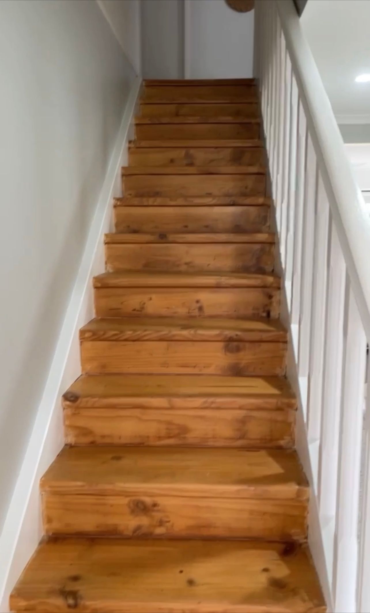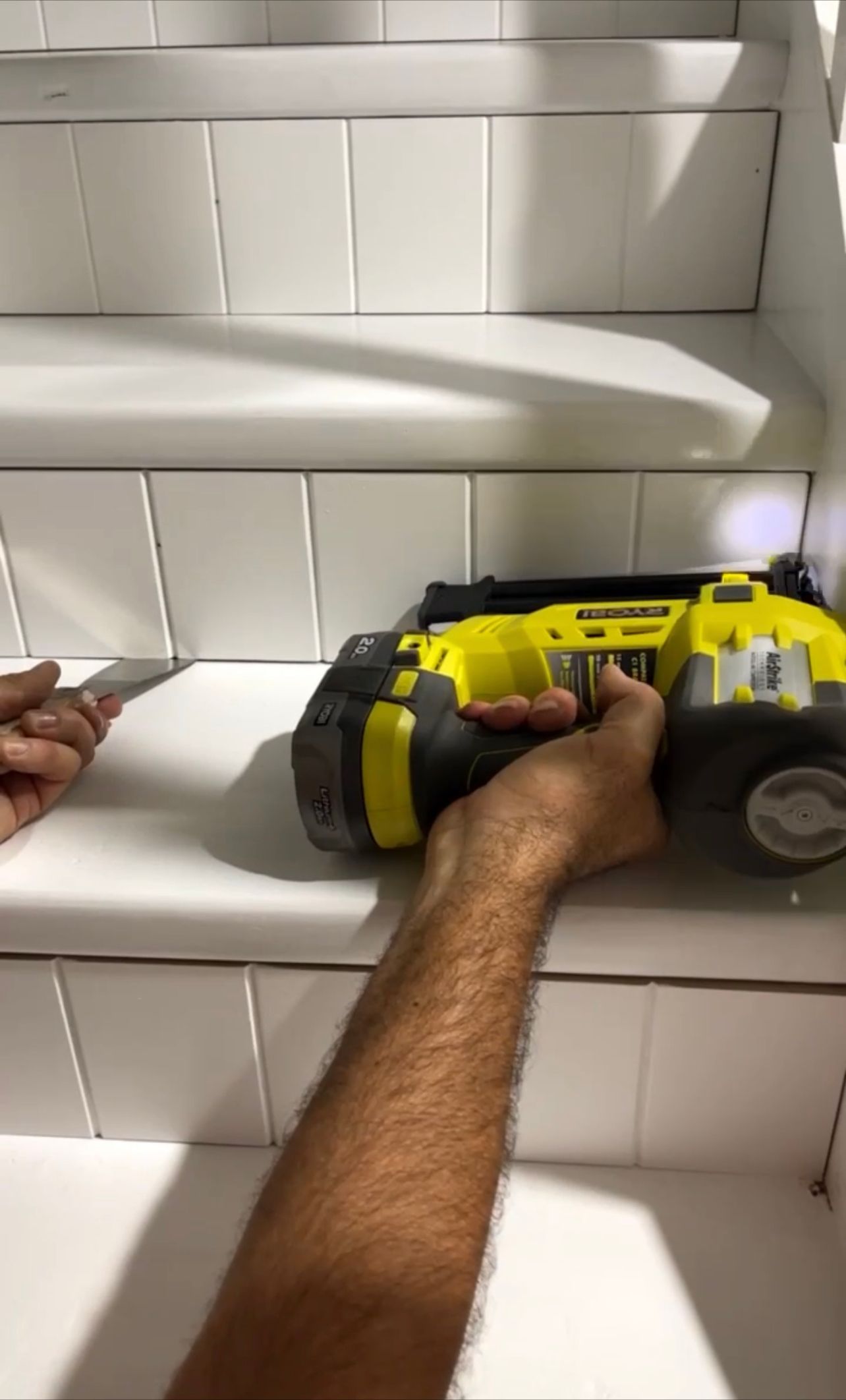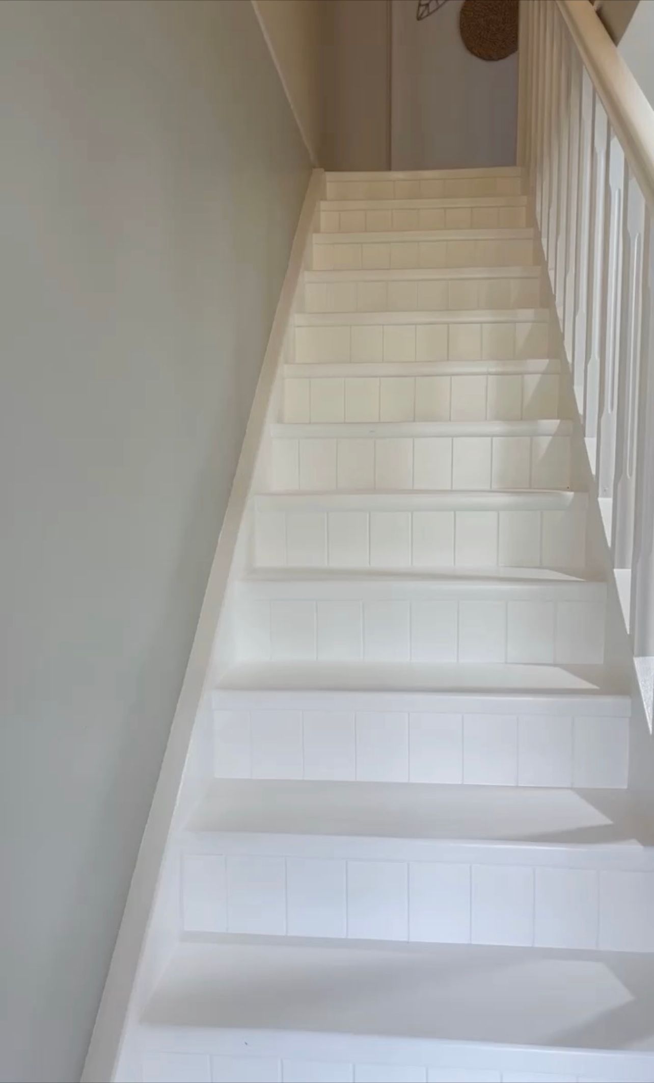 Once paint was dry, we nailed the vj pieces into the front of each stairs and applyed the gap filler around each board .