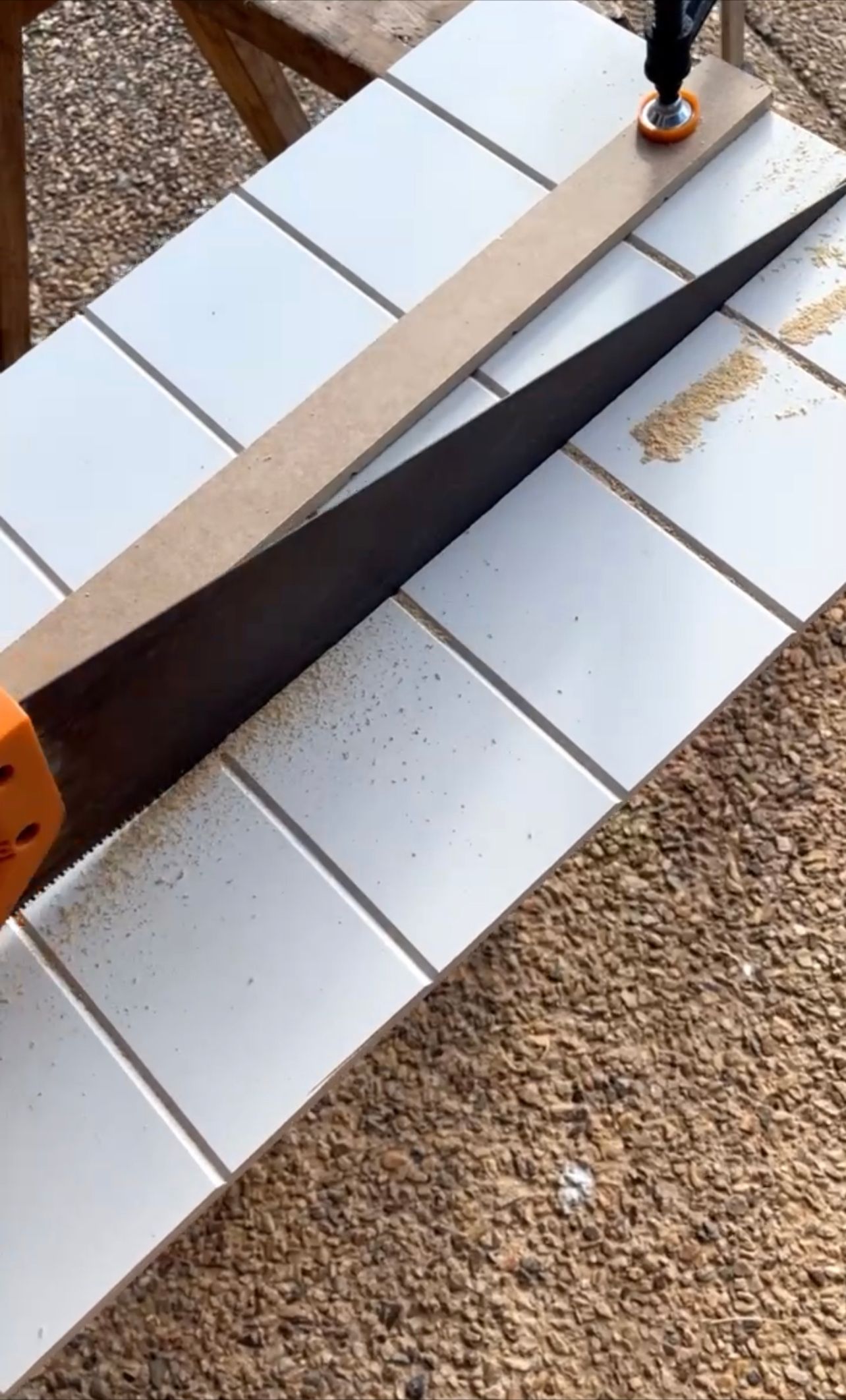 Then we measured the front of each stairs individually to fit and cut the vj board and Idecided to paint each board twice before installing them , much easier this way.
